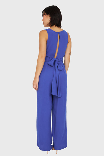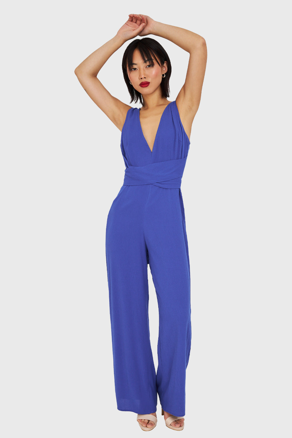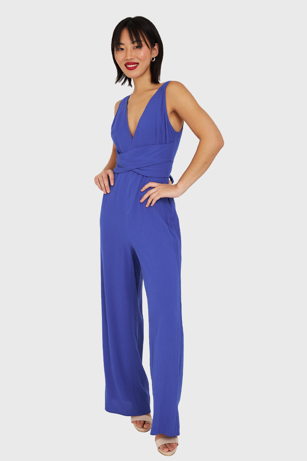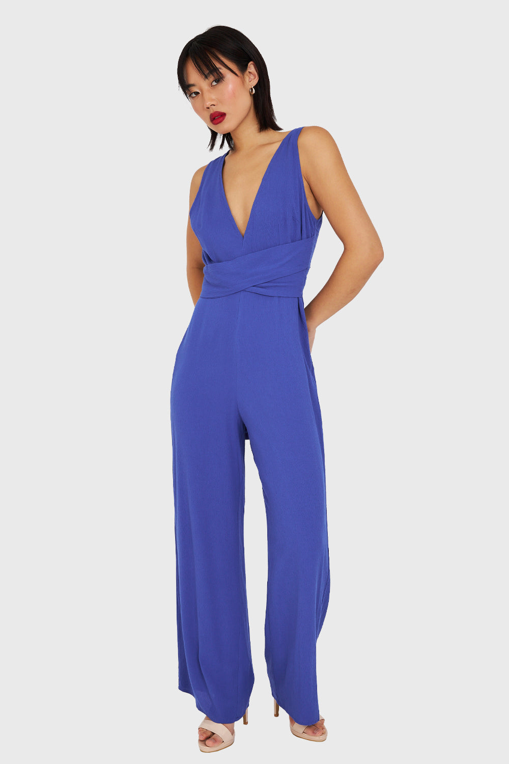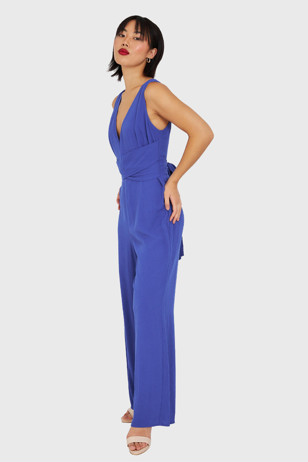 Características: Enterito escote en V con lazo de ajuste en la cintura. Escote en espalda con botón de ajuste en el cuello y cierre en la parte inferior del pantalón.