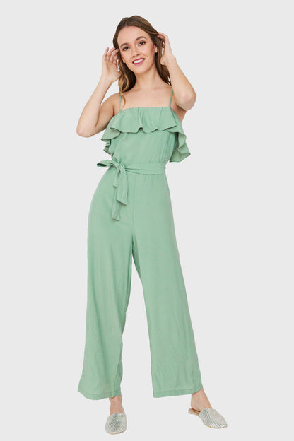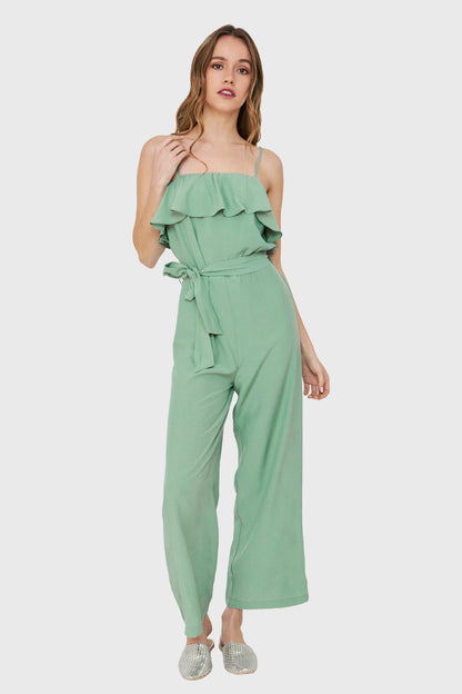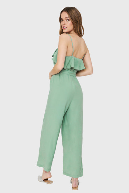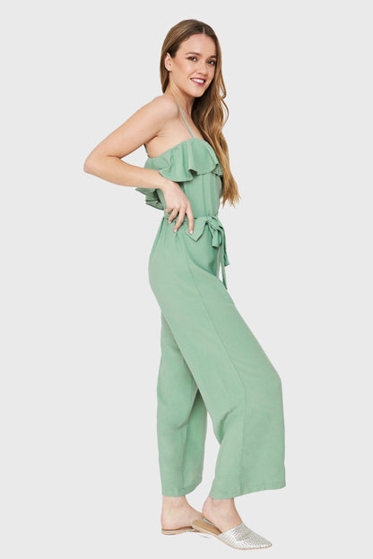 Características: Enterito escote vuelo con pabilo ajustable, espalda elasticada y lazo de ajuste en cintura. Pierna recta.