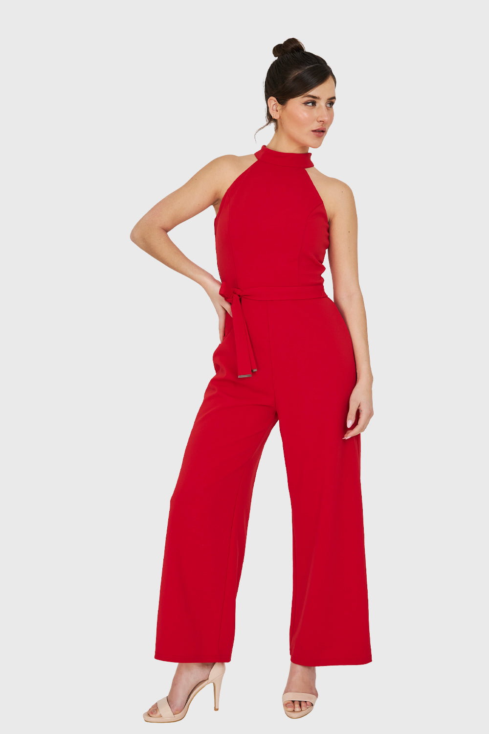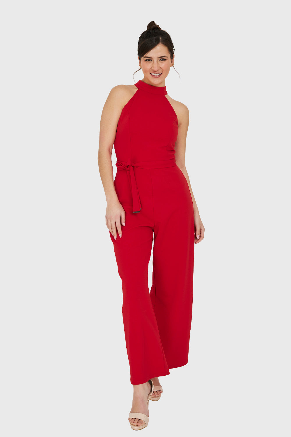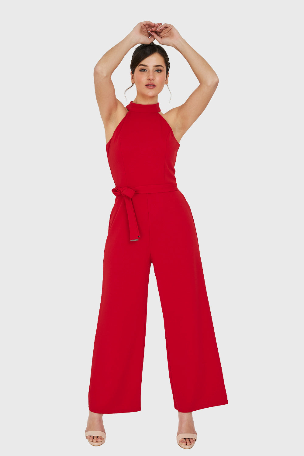 Características: Enterito escote halter con cierre invisible y lazo de ajuste en cintura. Pierna ancha y forro en la parte superior.