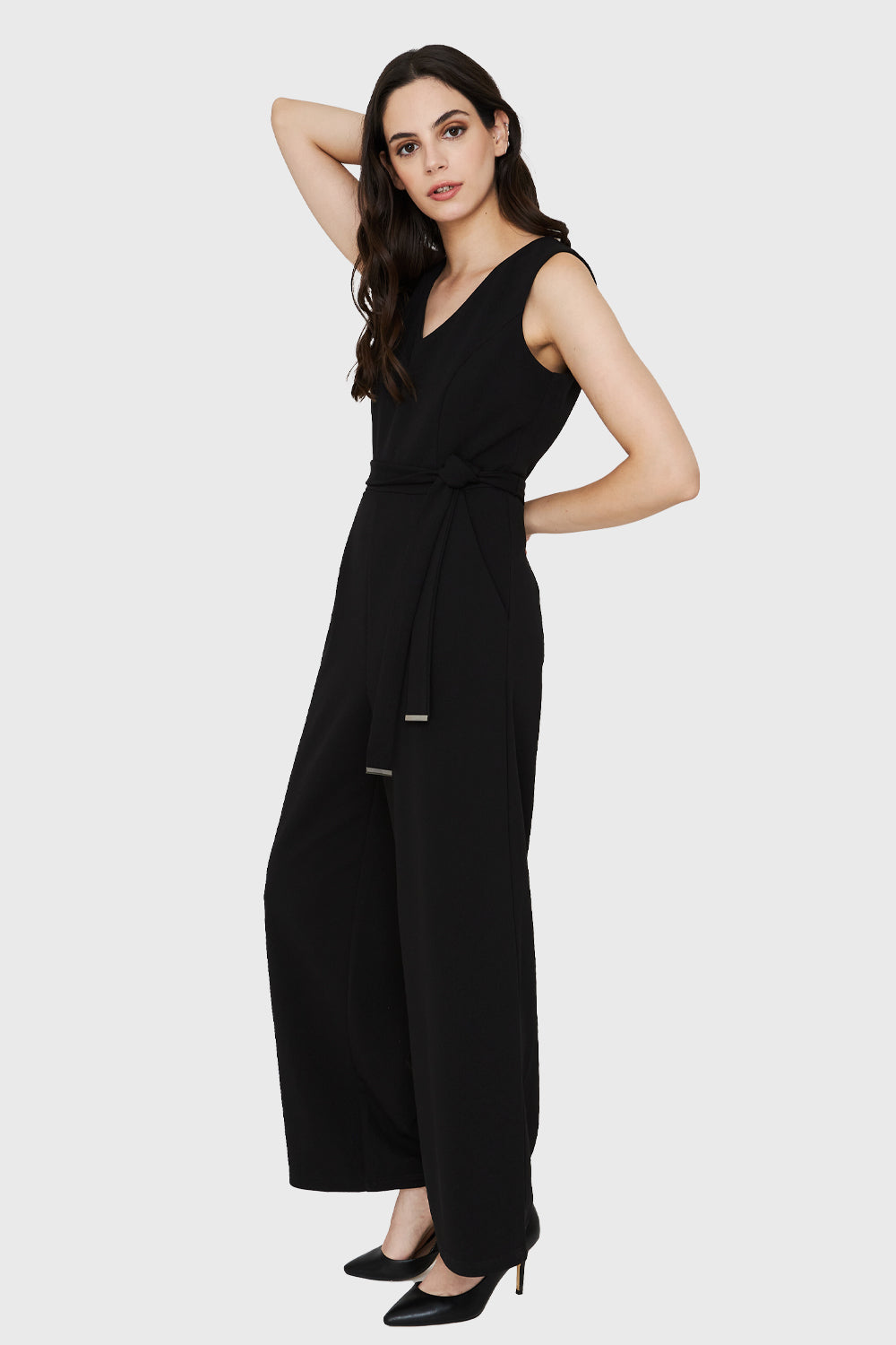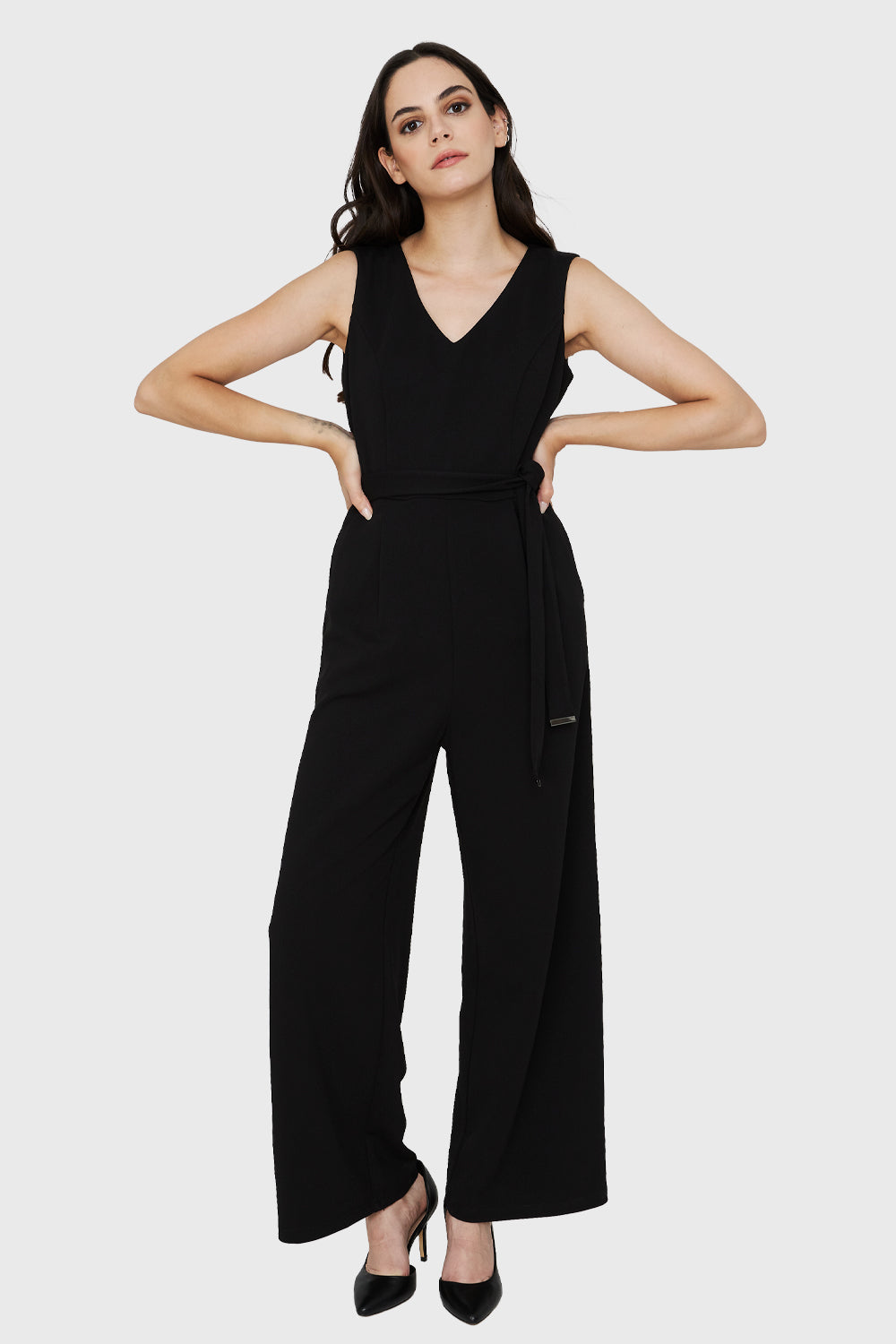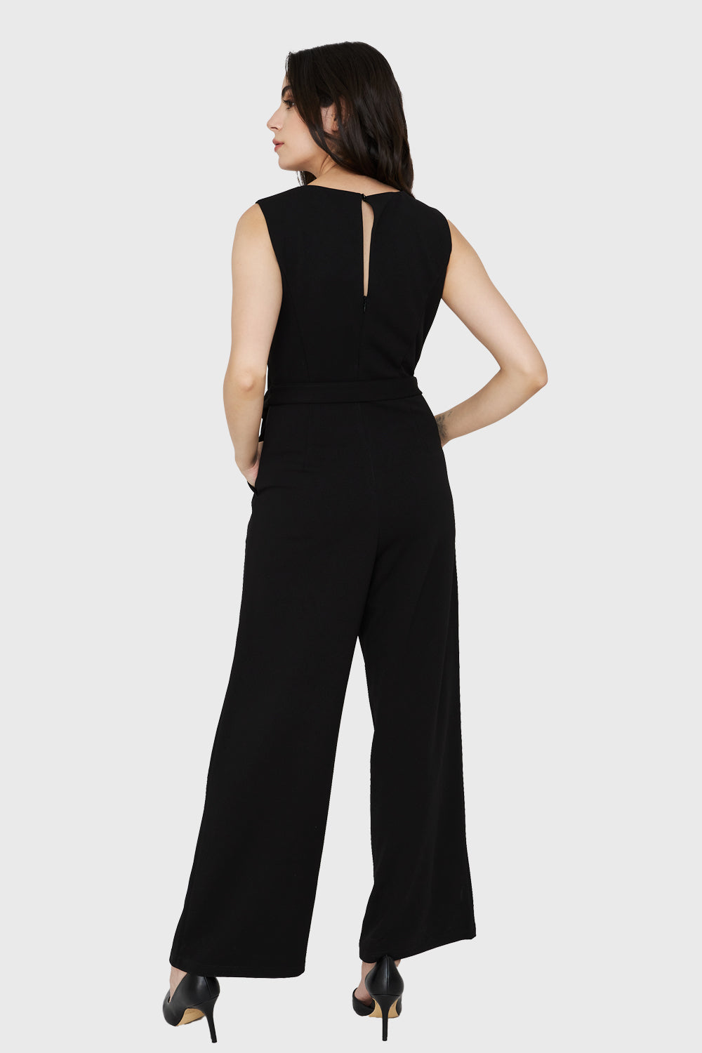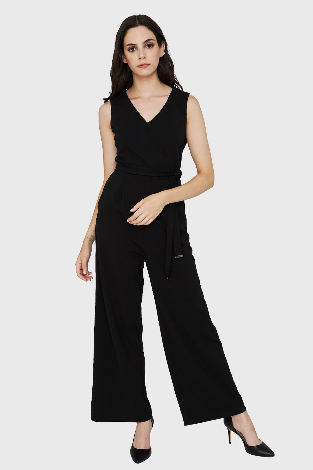 Características: Enterito escote V sin mangas con lazo de ajuste en la cintura. Cierre en espalda y botón de ajuste.