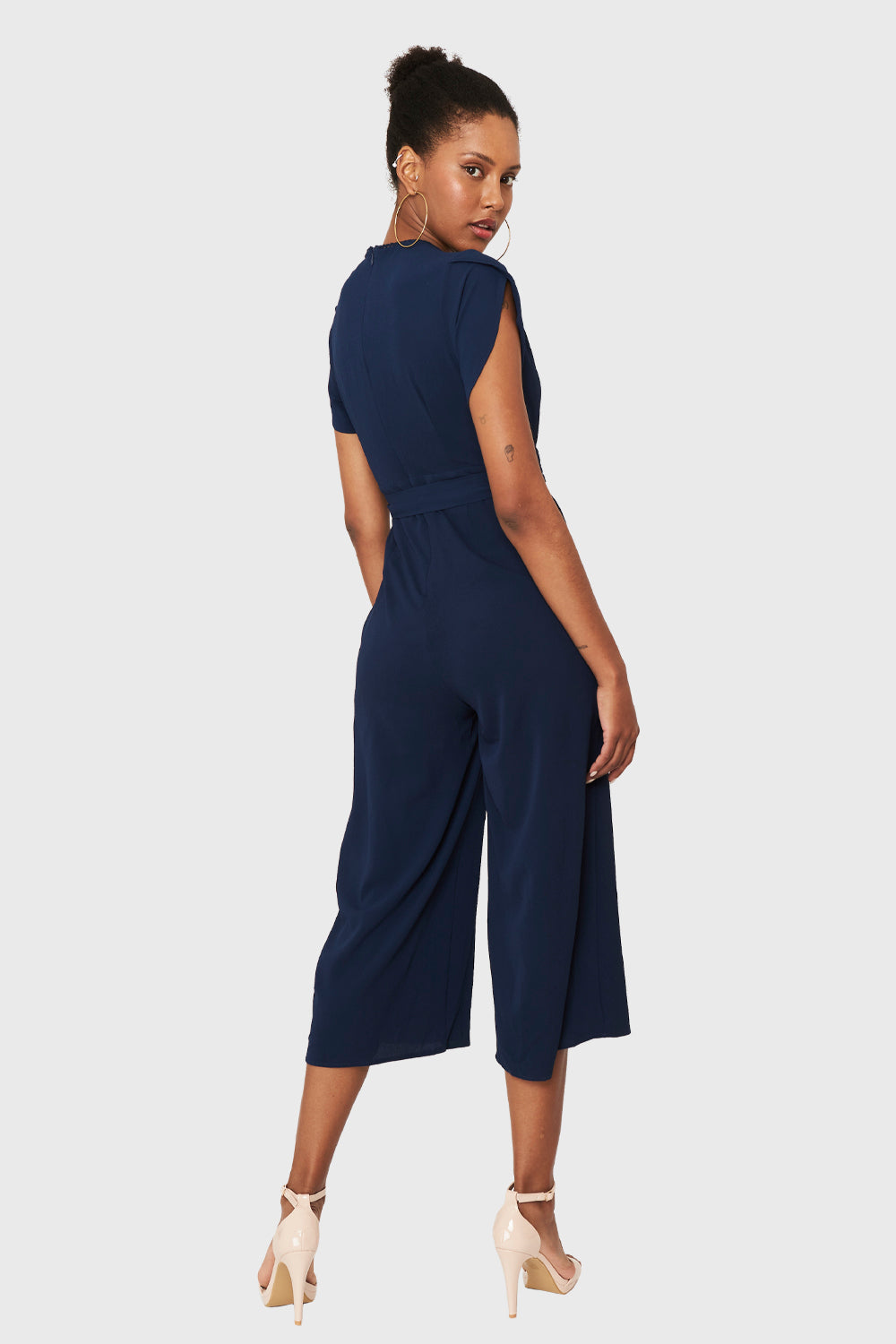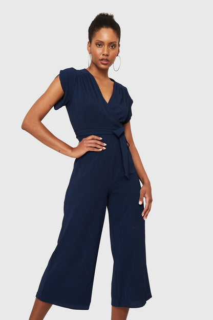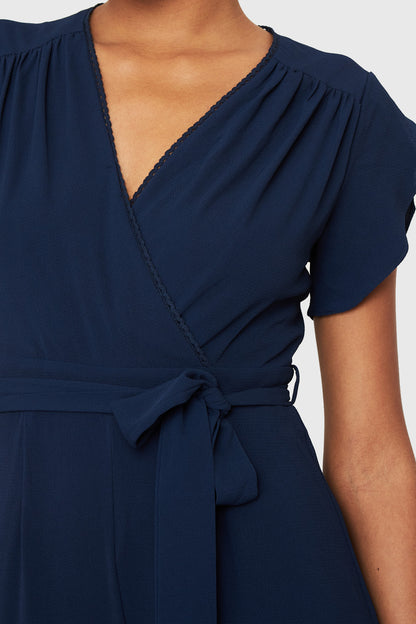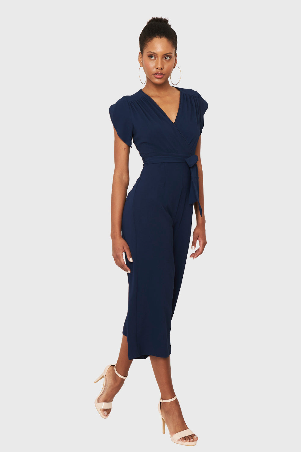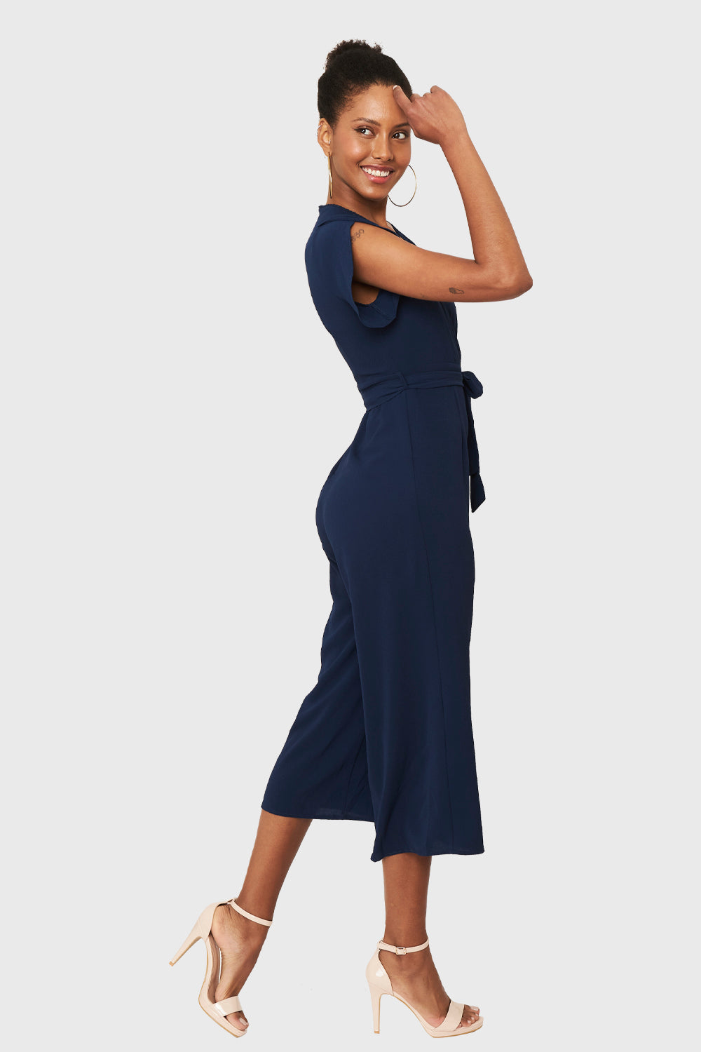 Características: Enterito manga corta tipo vuelos. Cierre invisible en espalda. Presillas en la cintura para lazo de ajuste. Escote en V cruzado. Posee forro.