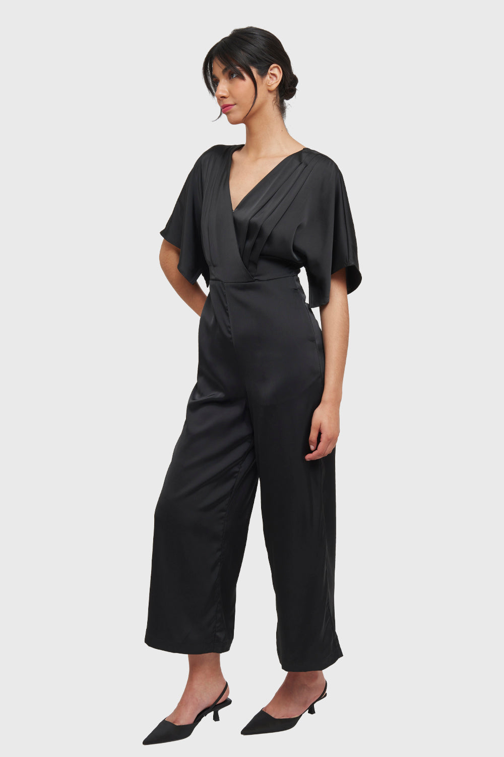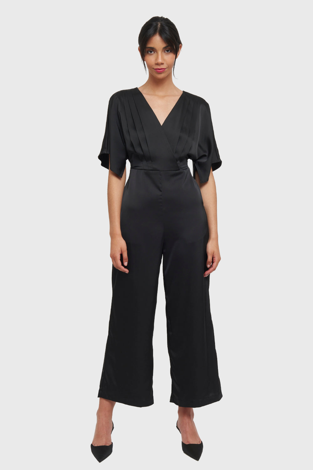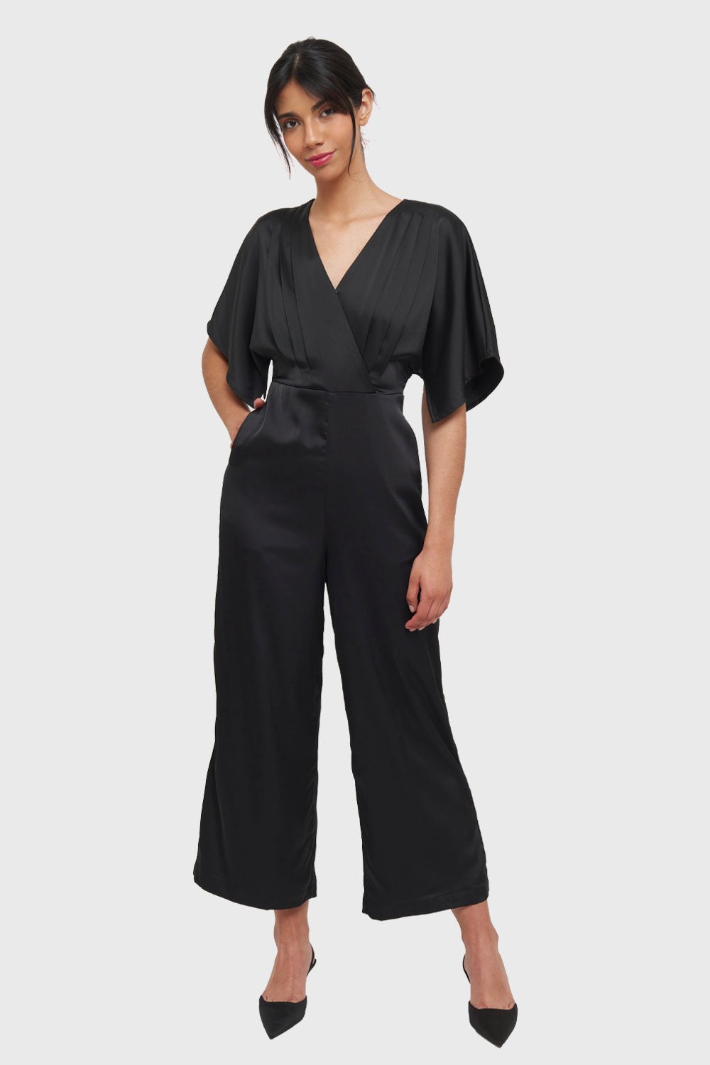 Características:Enterito tipo satín, escote V cruzado y manga corta amplia. Tiene pliegues en la parte superior y botón de ajuste. Pierna ancha y cierre en espalda. Posee bolsillos laterales y forro.