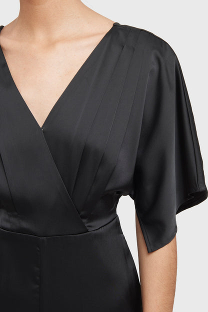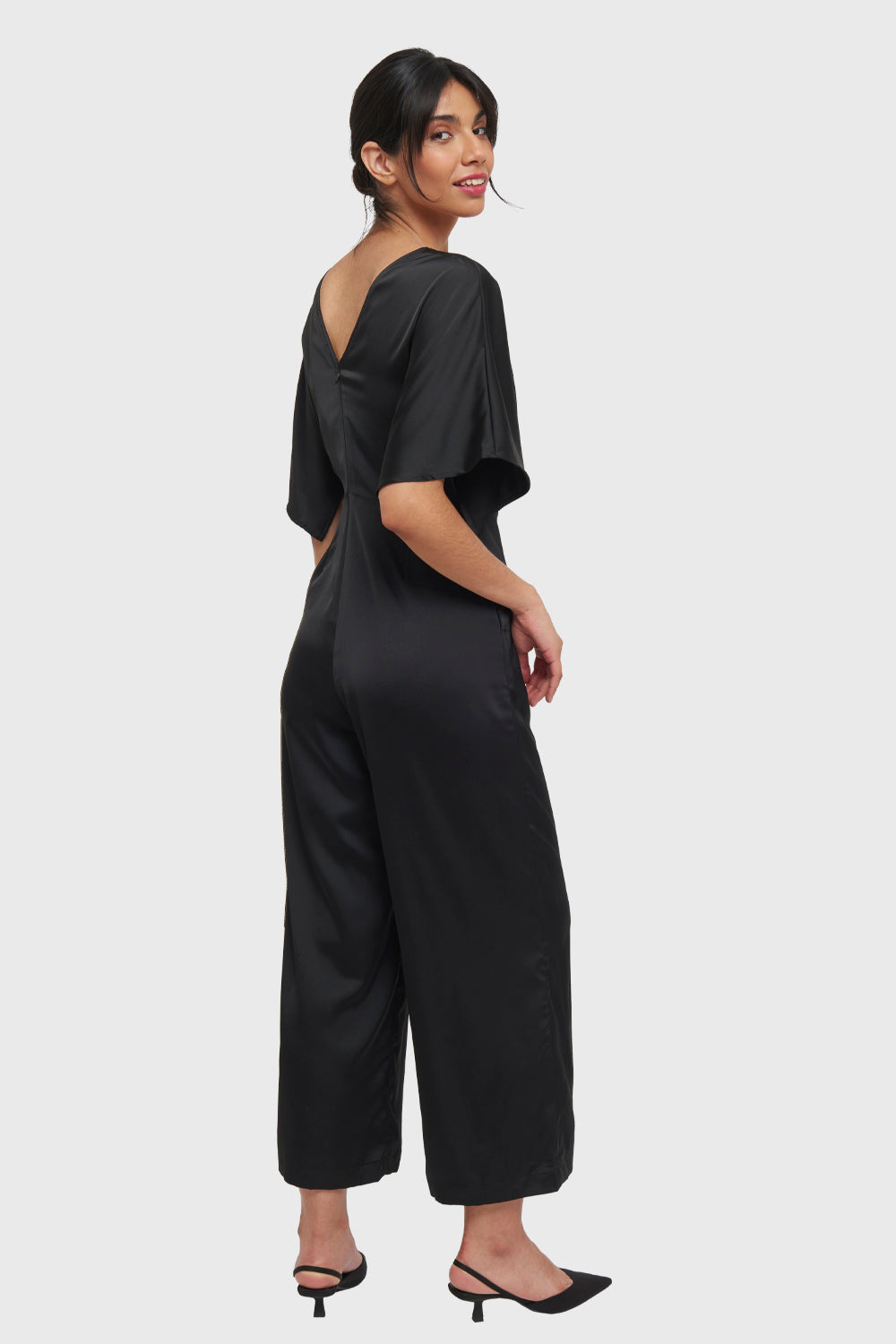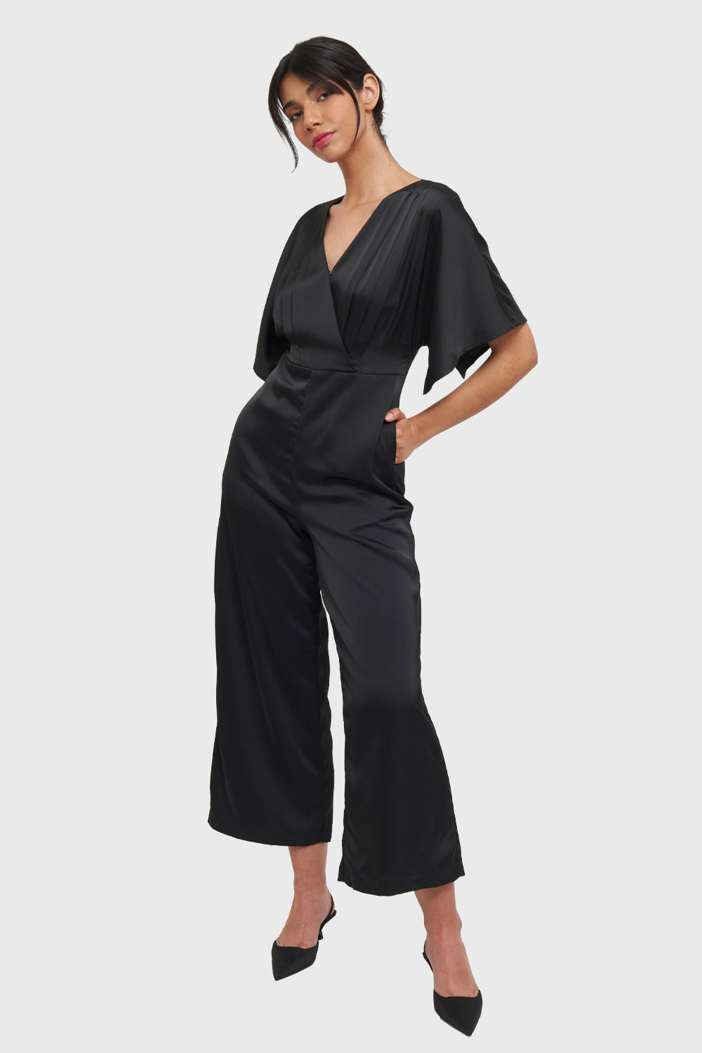 Características:Enterito tipo satín, escote V cruzado y manga corta amplia. Tiene pliegues en la parte superior y botón de ajuste. Pierna ancha y cierre en espalda. Posee bolsillos laterales y forro.
