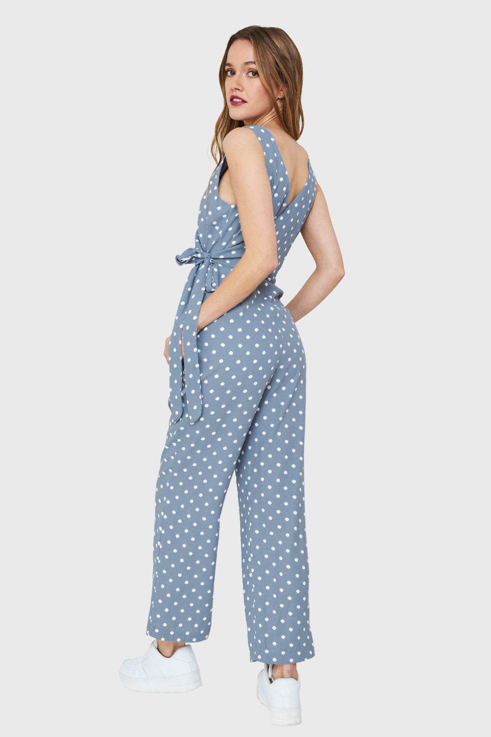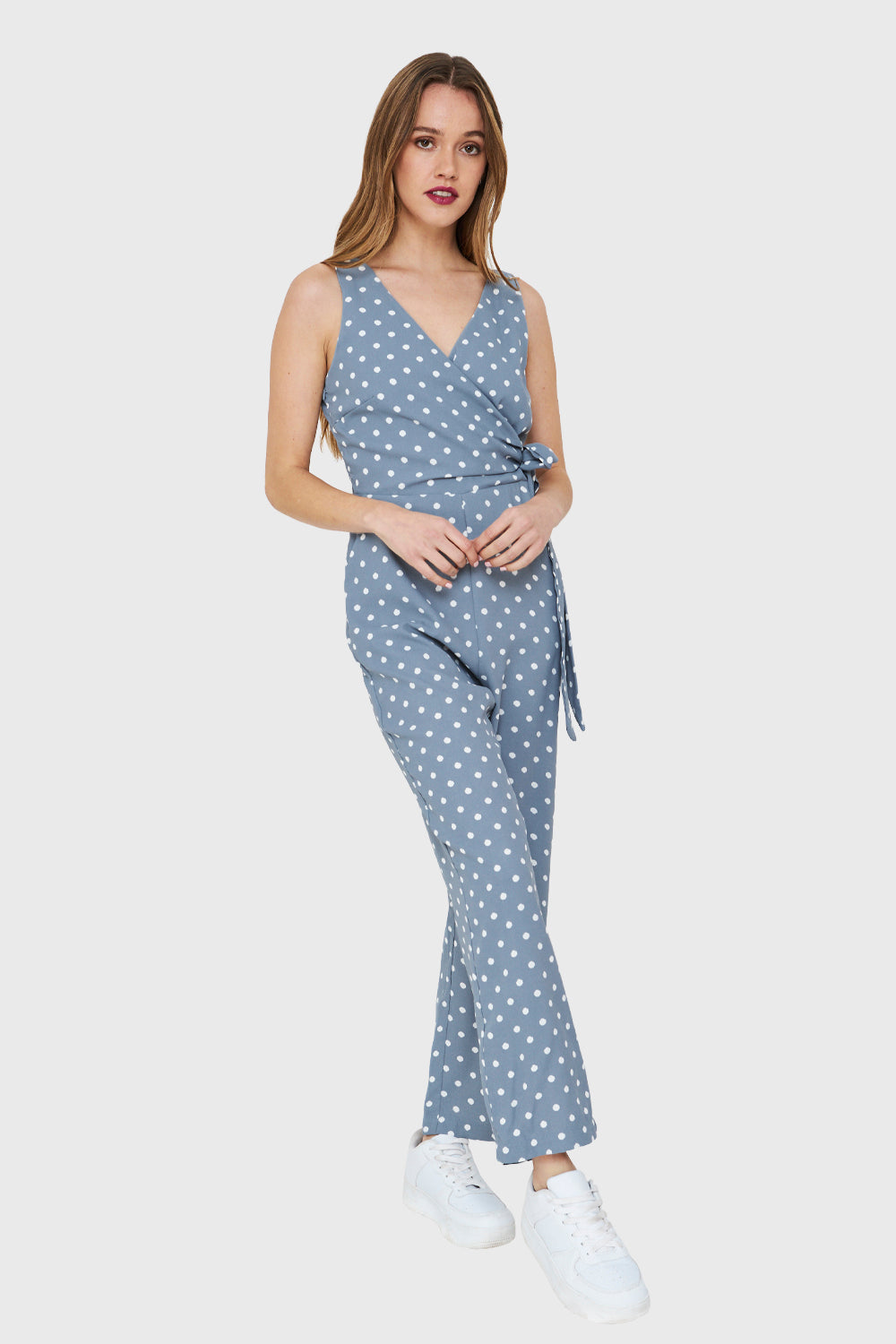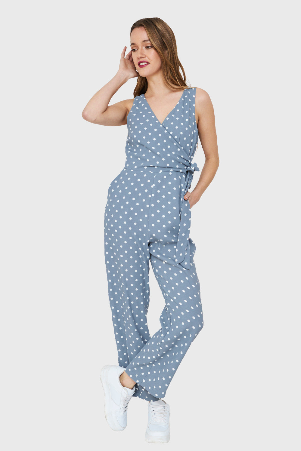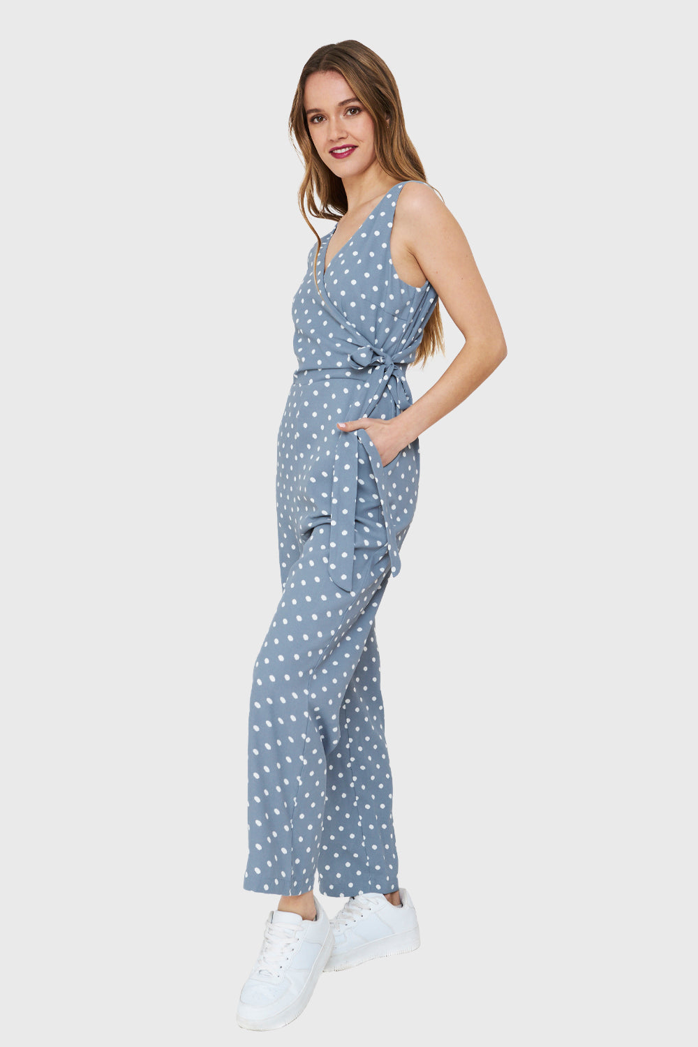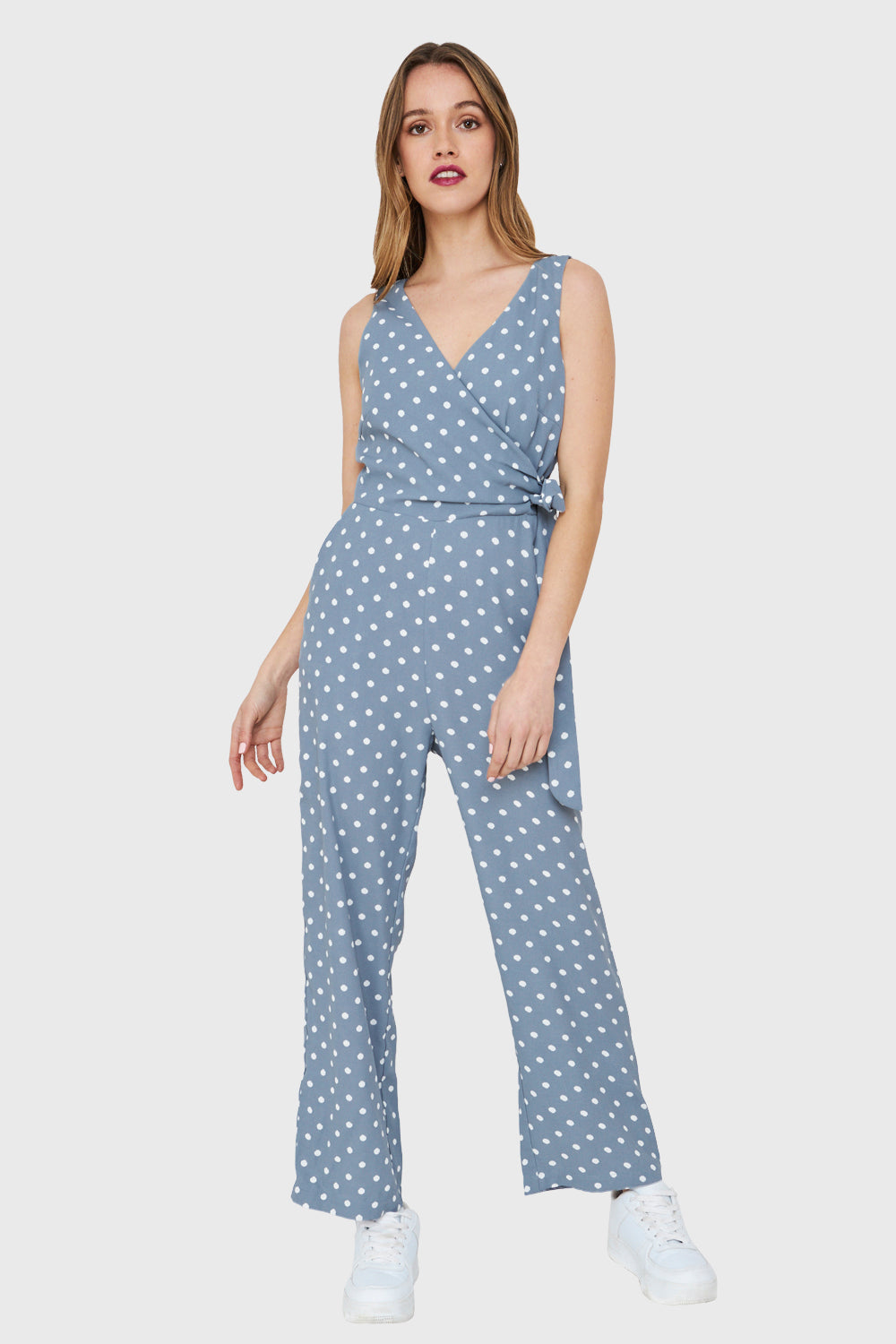 Características: Enterito escote V cruzado print lunares con cinta de ajuste al costado. Posee bolsillos y cierre lateral. Pierna recta, tirante ancho y parte de arriba forrada.