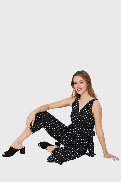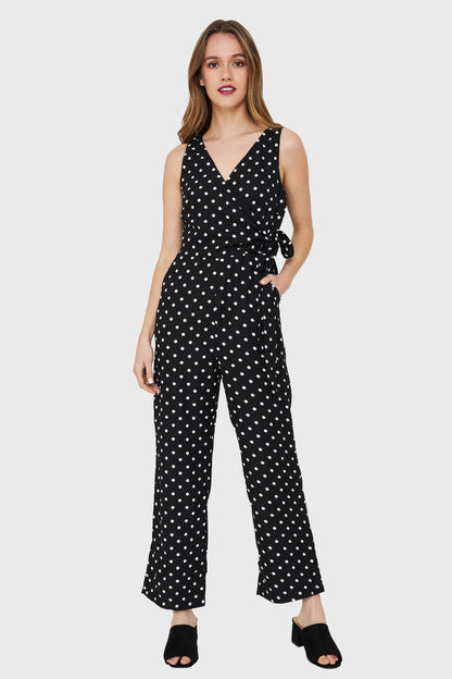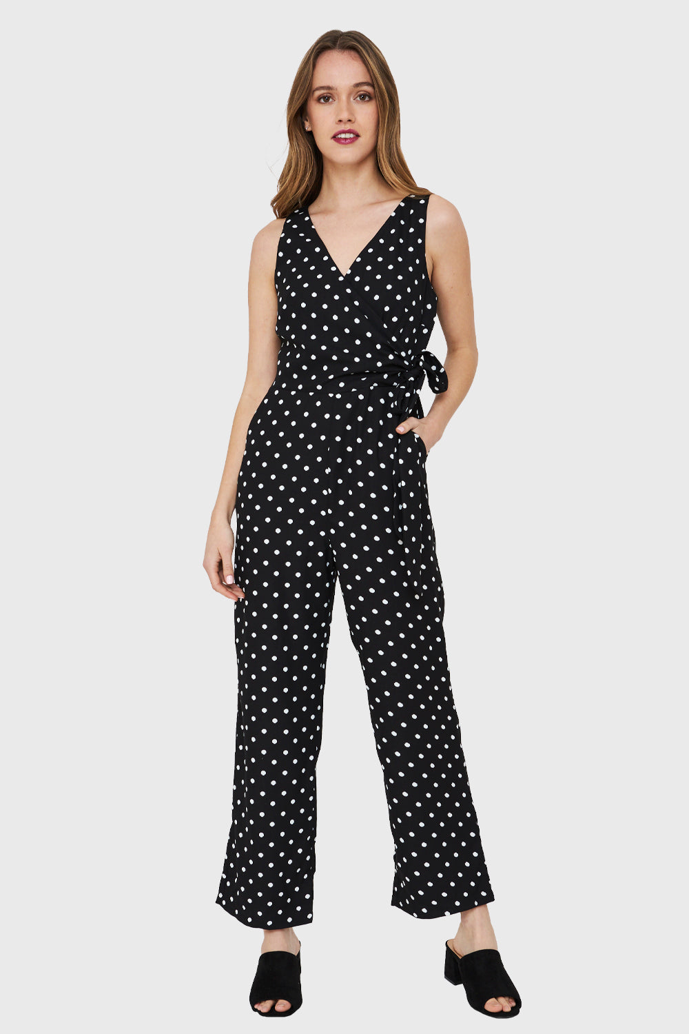 Características: Enterito escote V cruzado print lunares con cinta de ajuste al costado. Posee bolsillos y cierre lateral. Pierna recta, tirante ancho y parte de arriba forrada.