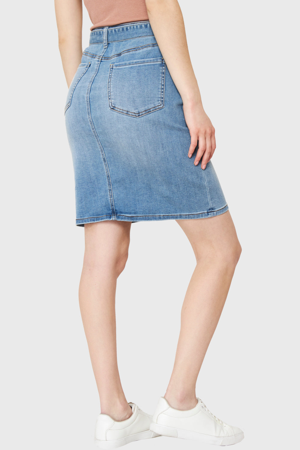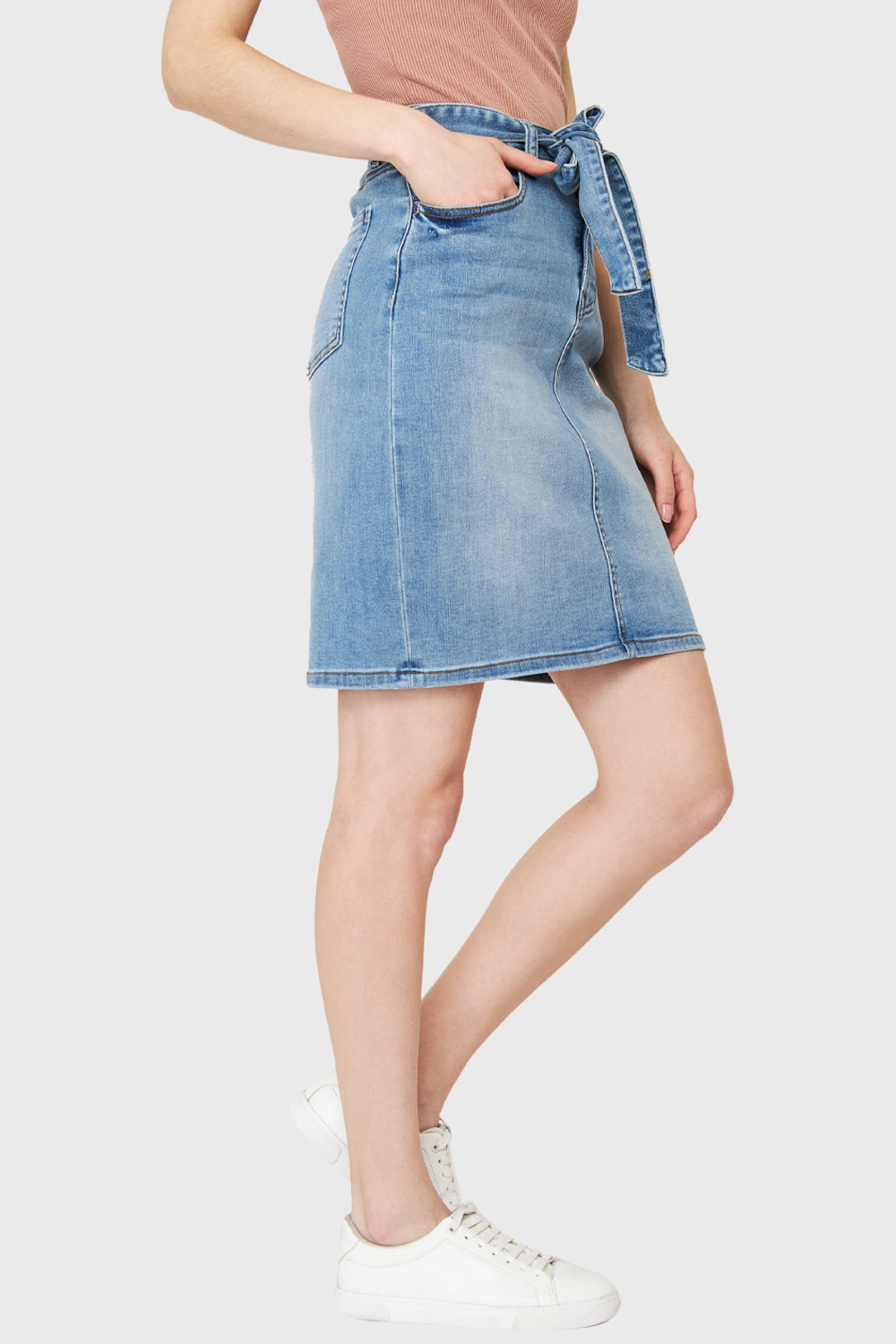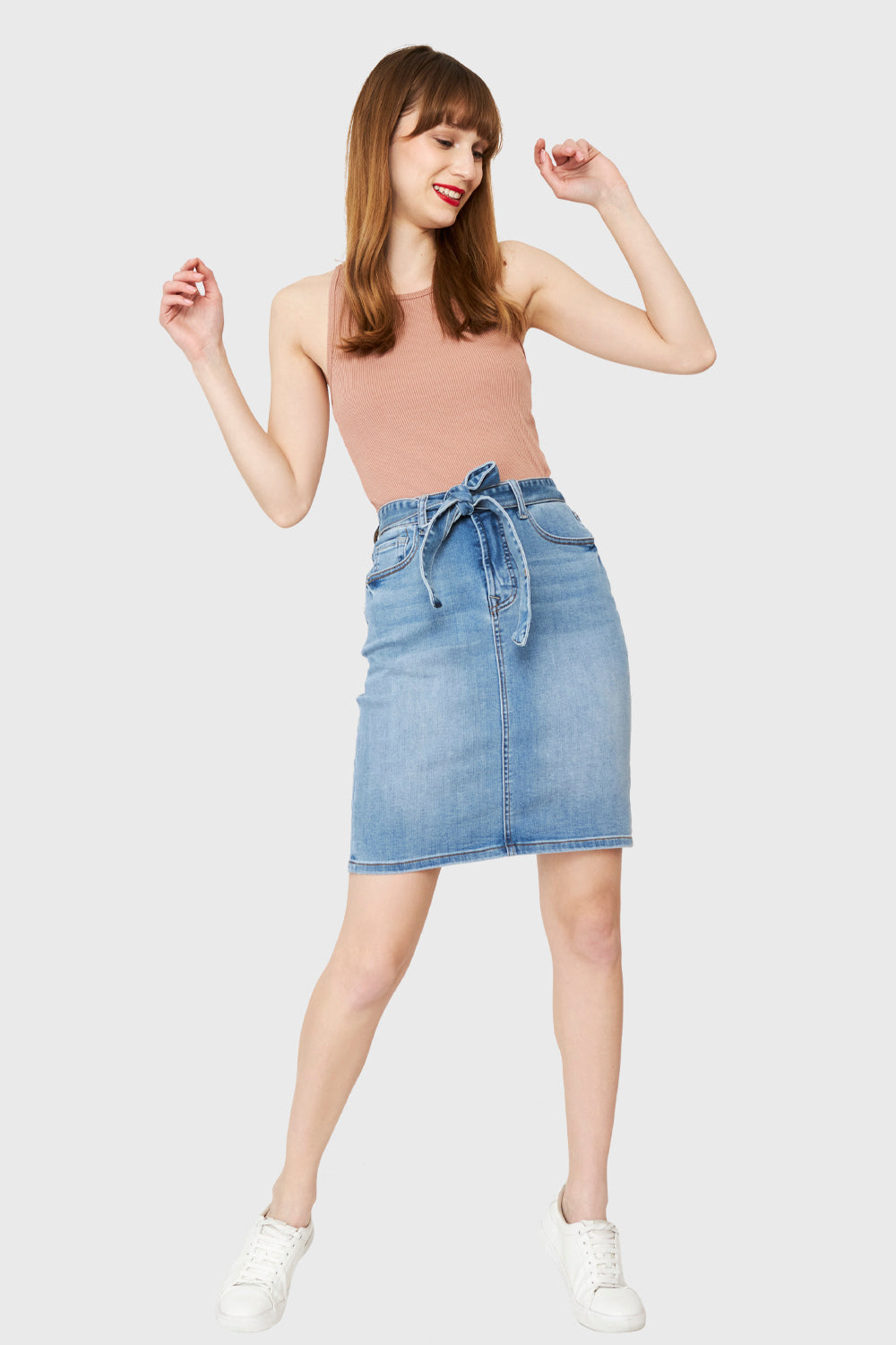 Características: Falda básica corta de jeans con lazo. Todos sus bolsillos son funcionales. Presillas en pretina para lazo de ajuste. Botón metálico y cierre de ajuste. Sin forro. Elasticada.