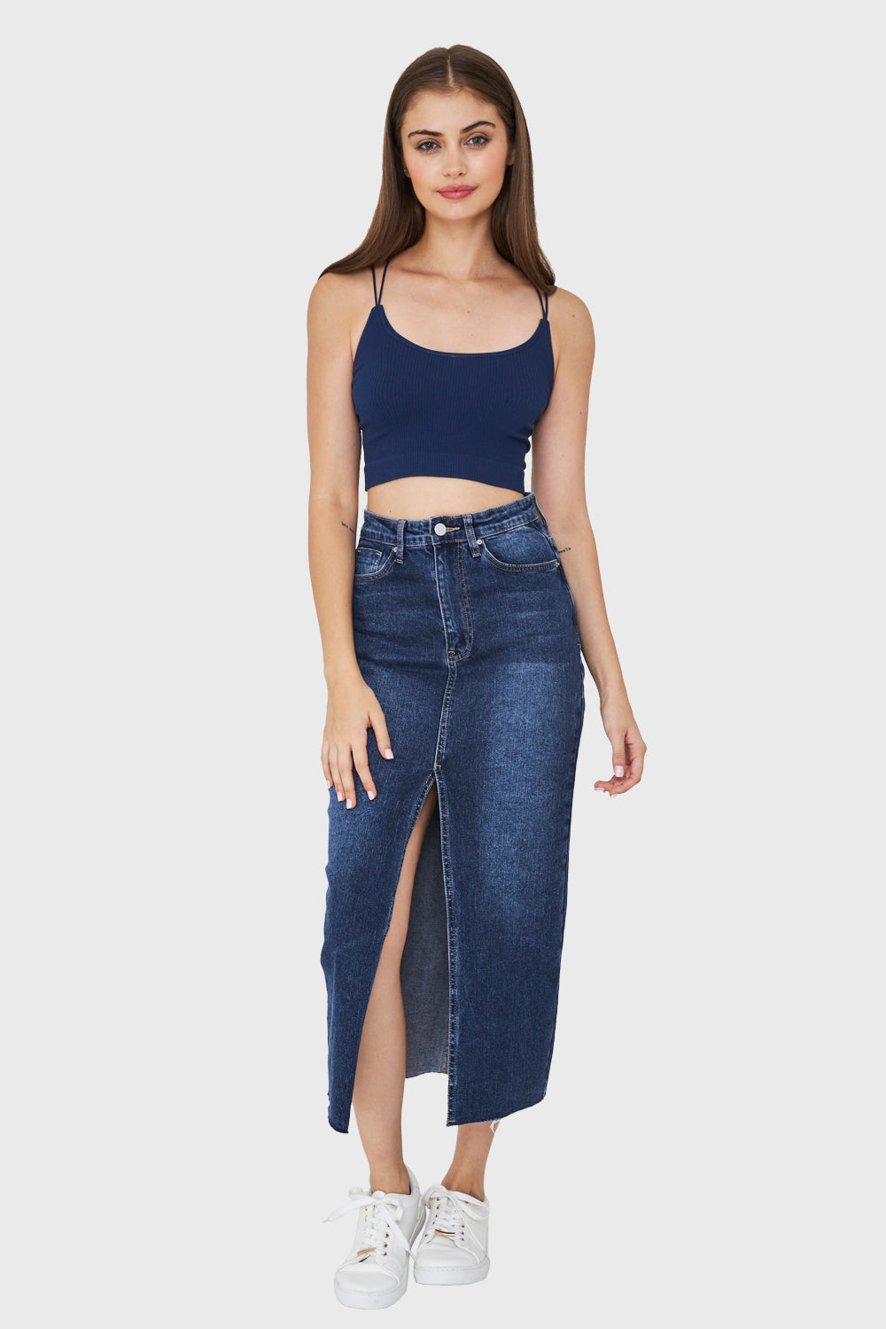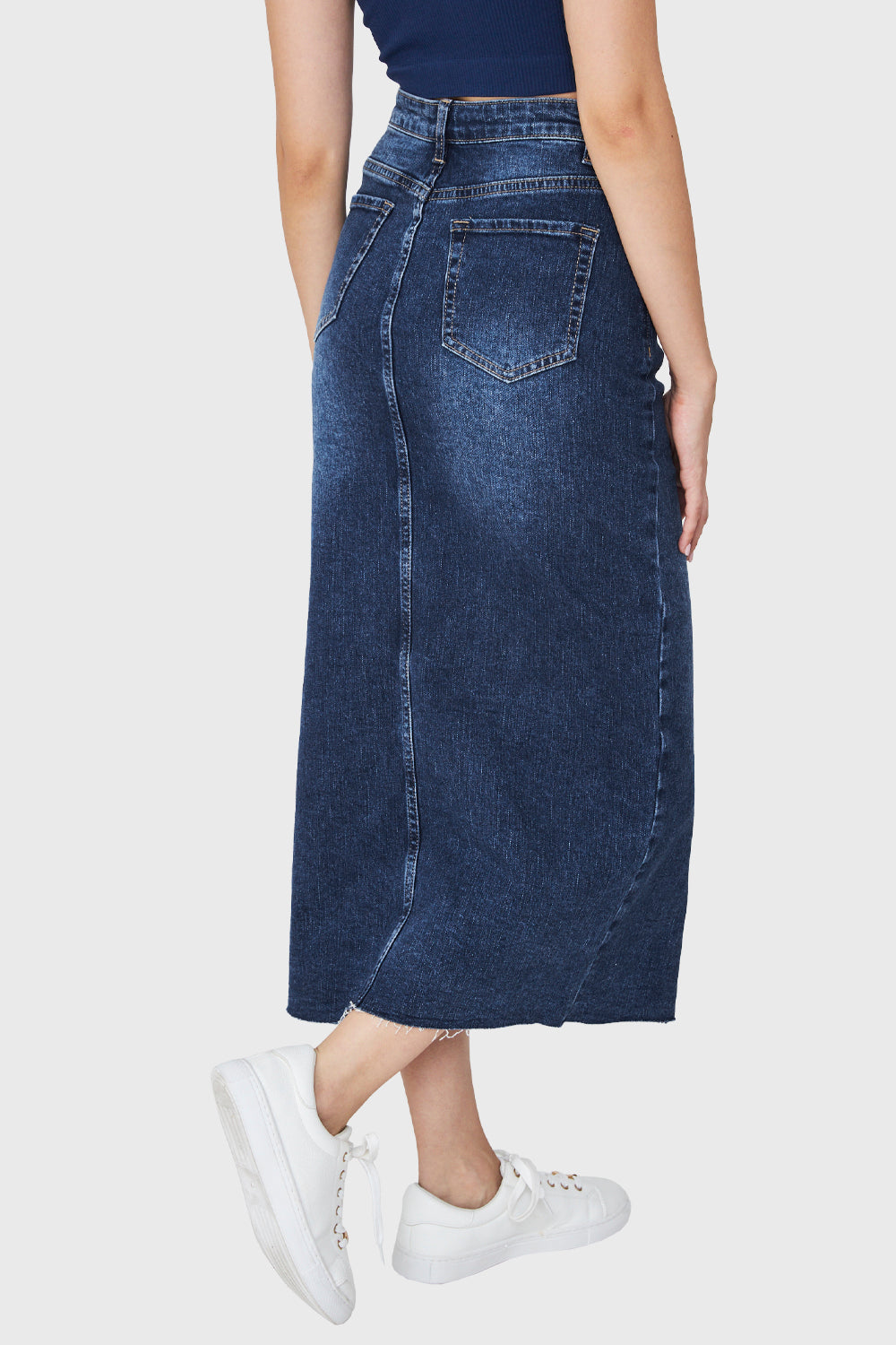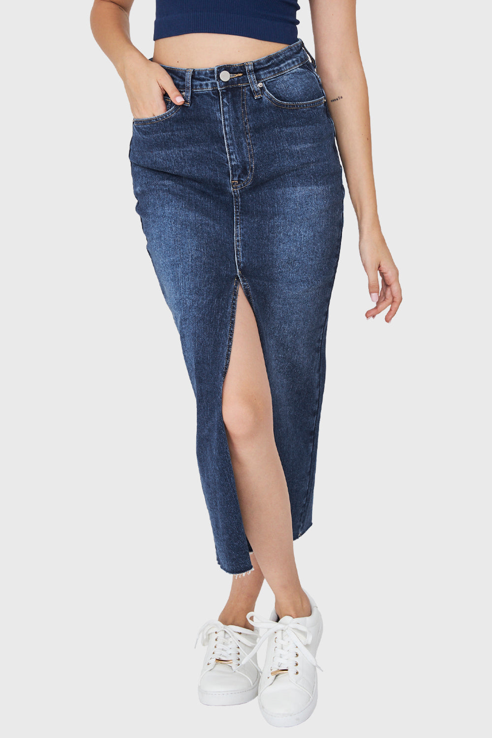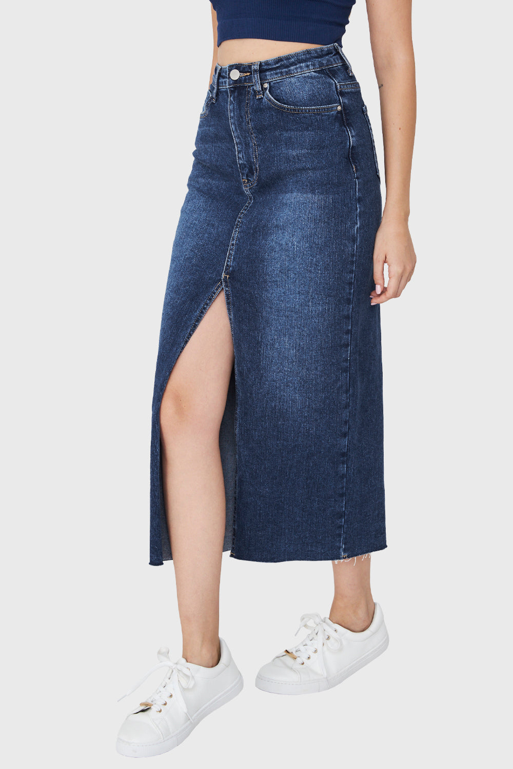 Características: Falda larga elasticada denim con tajo en la parte frontal. Bolsillos delanteros y traseros funcionales.