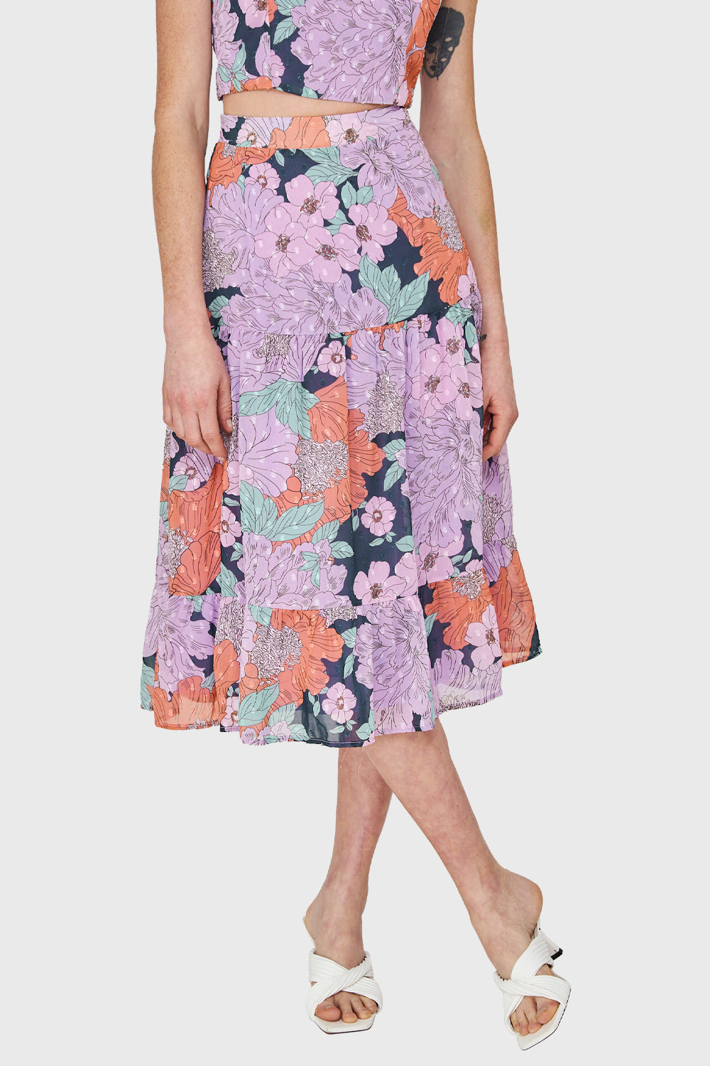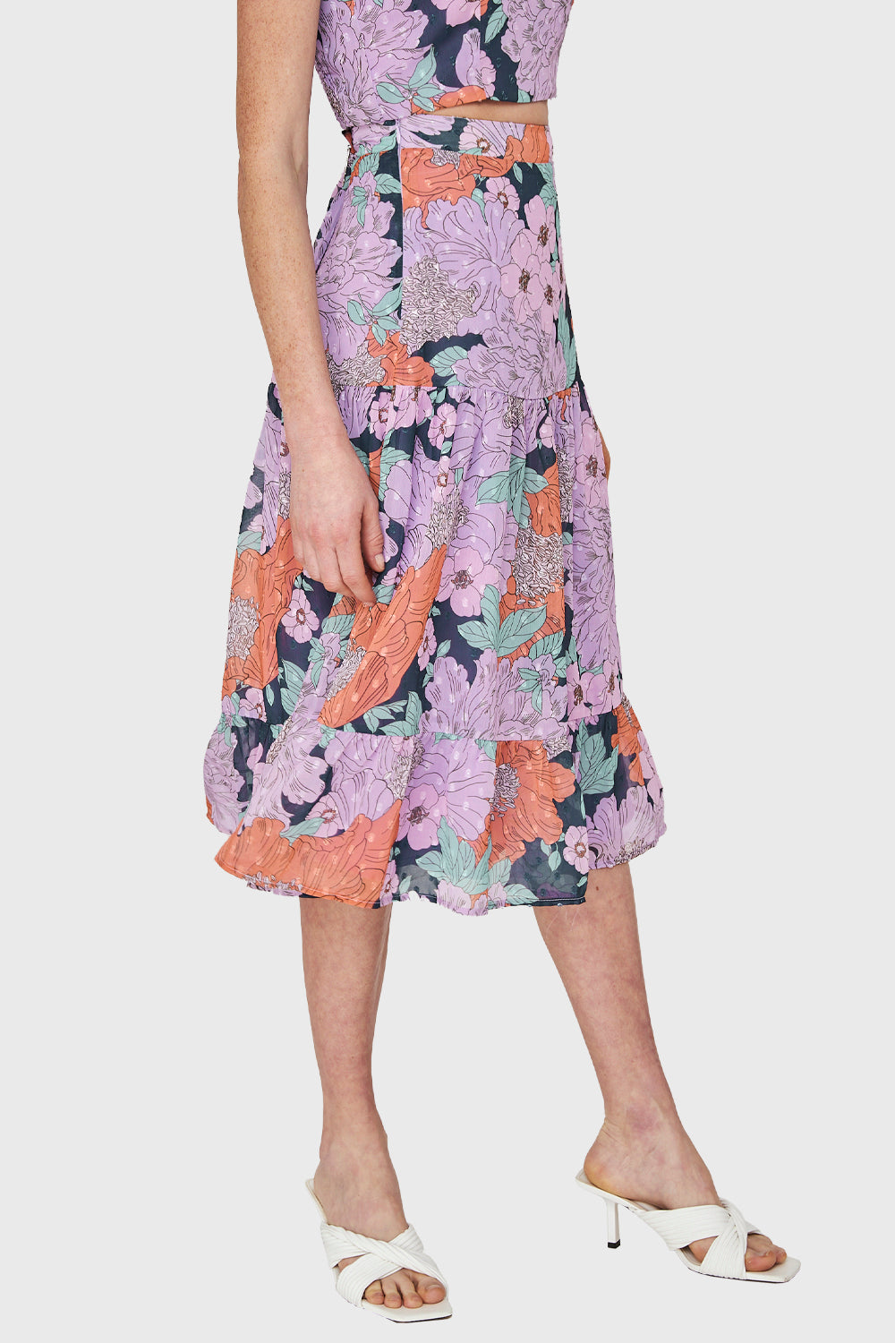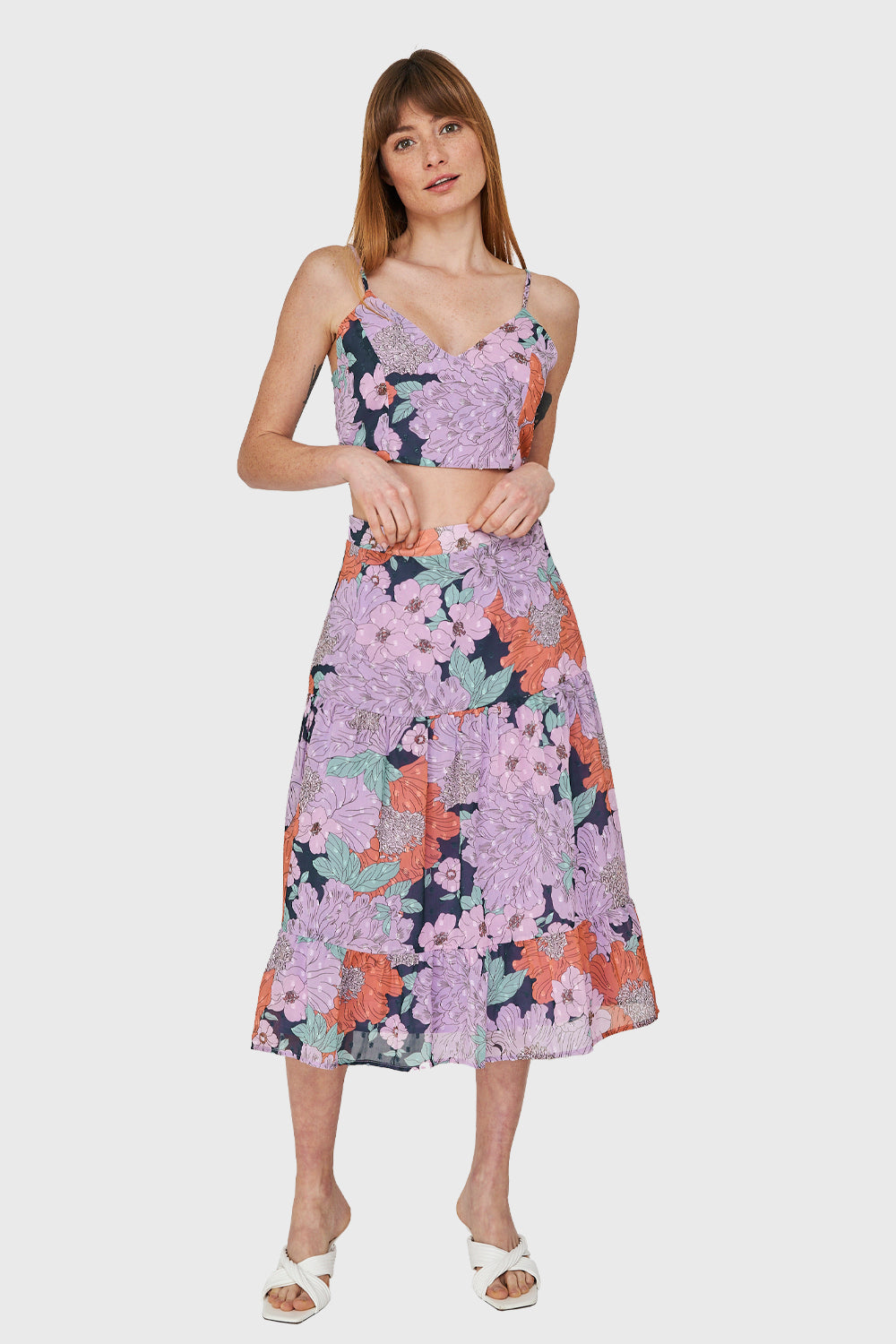 Características: Falda larga floral con volantes. Posee cierre lateral y elástico en la cintura. Posee forro. Hace match con el peto N04130
