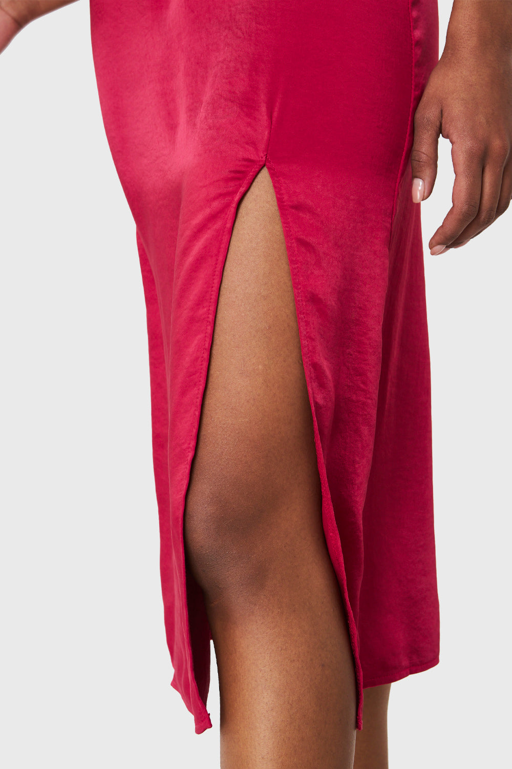 Características: Falda midi tipo satín con tajo delantero. Cierre invisible en la espalda. Tiro alto.