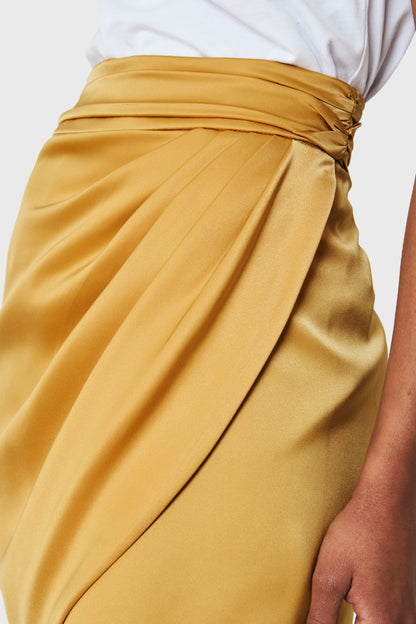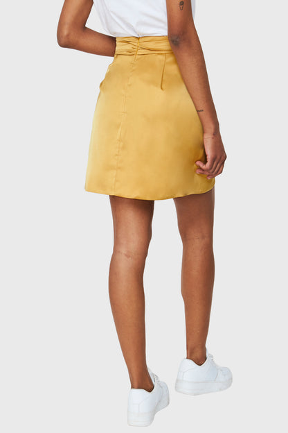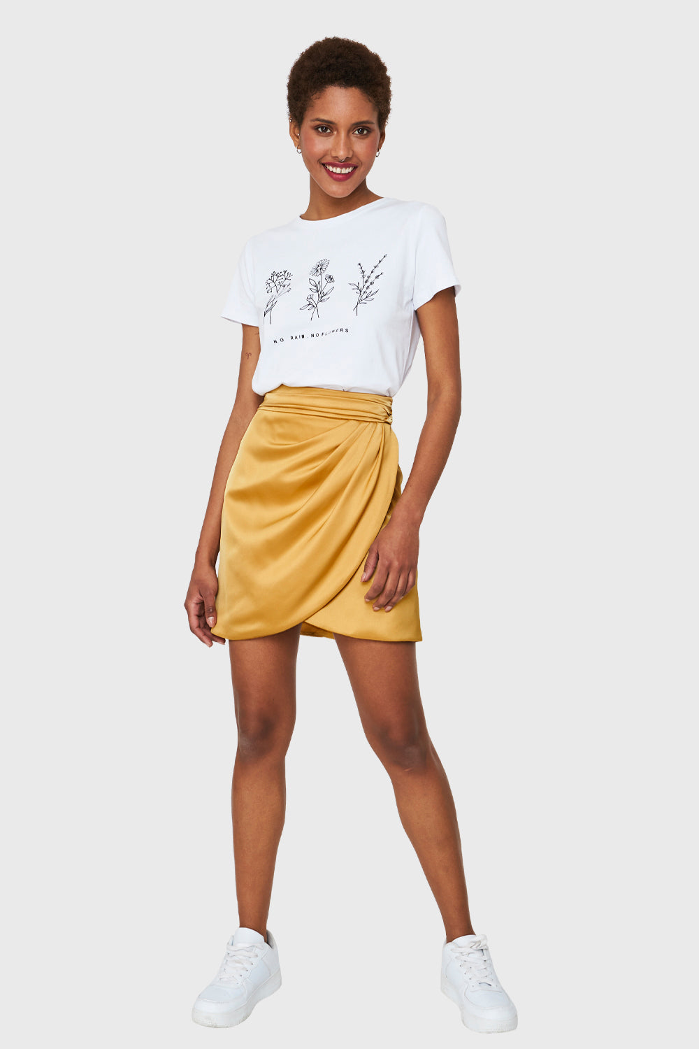 Características: Falda mini tipo satín con pliegues. Corte tulipán. Tiene cierre en la parte trasera. Posee forro.
