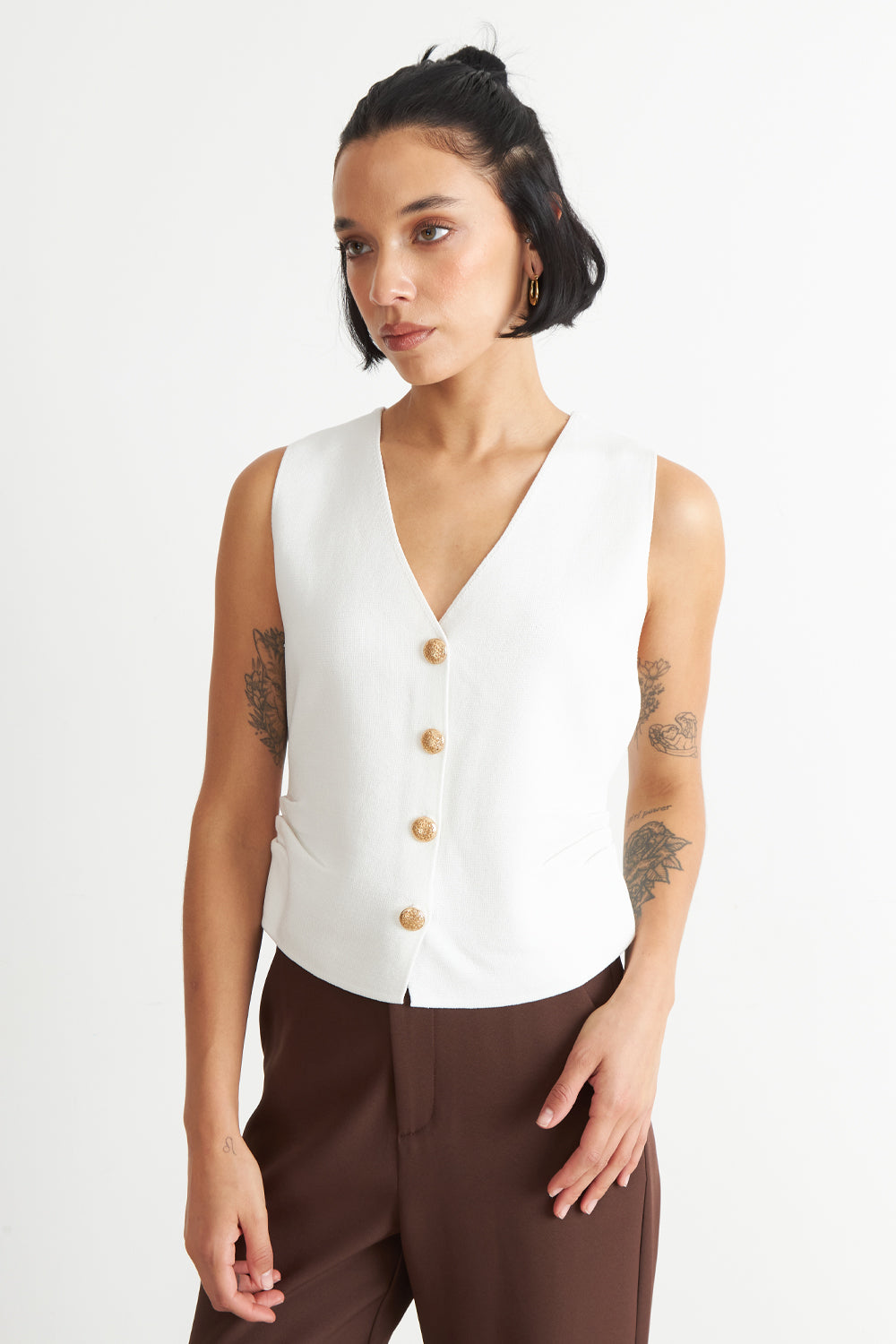 Características: Gilet de hilo con escote en V. Cuatro botones dorados funcionales para su ajuste.