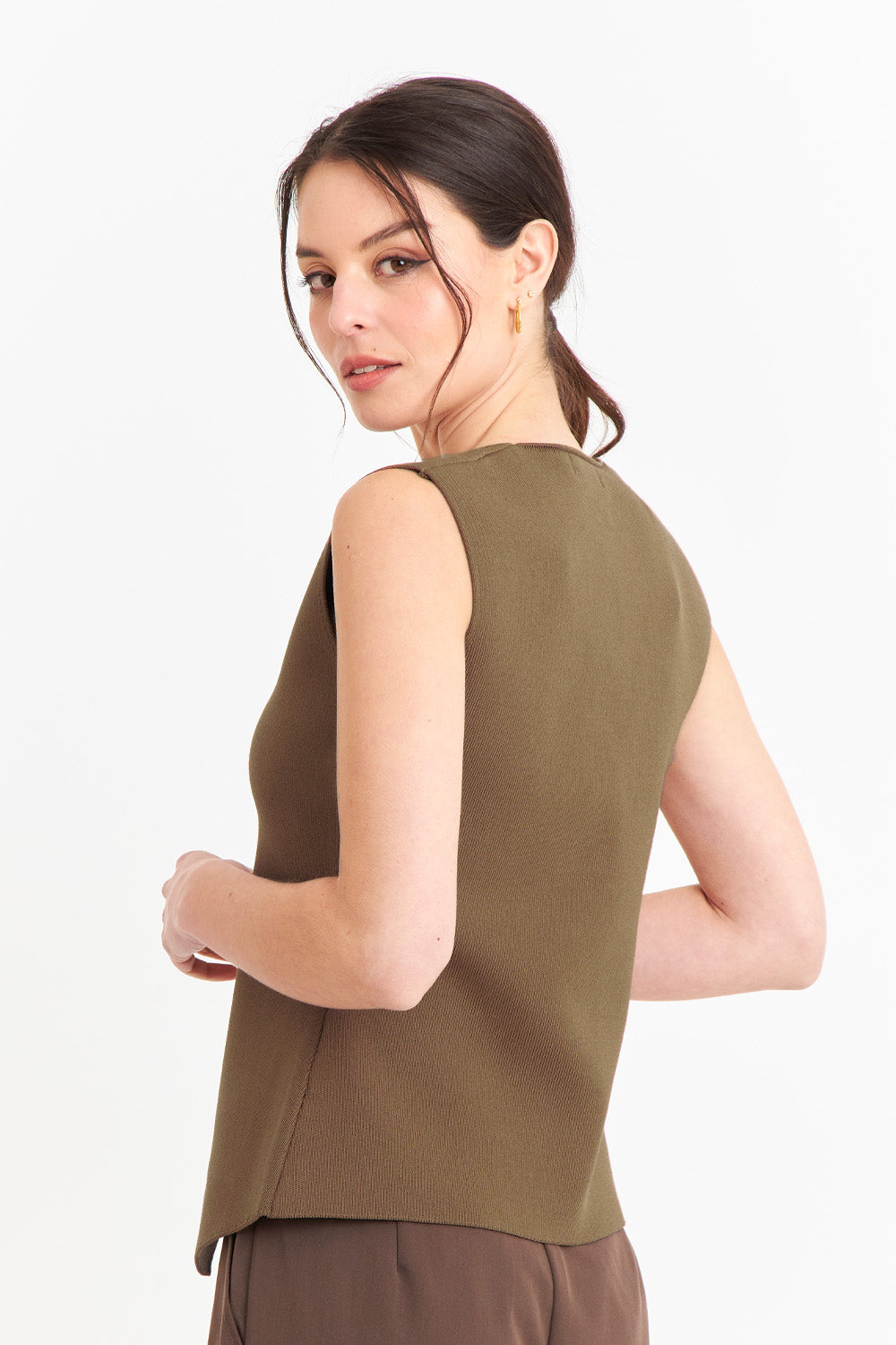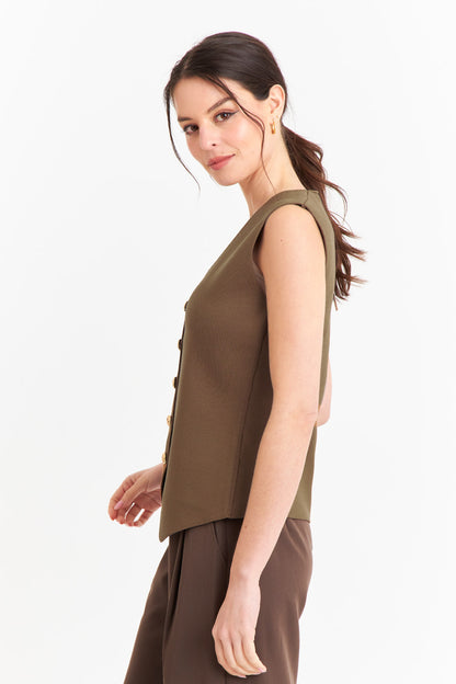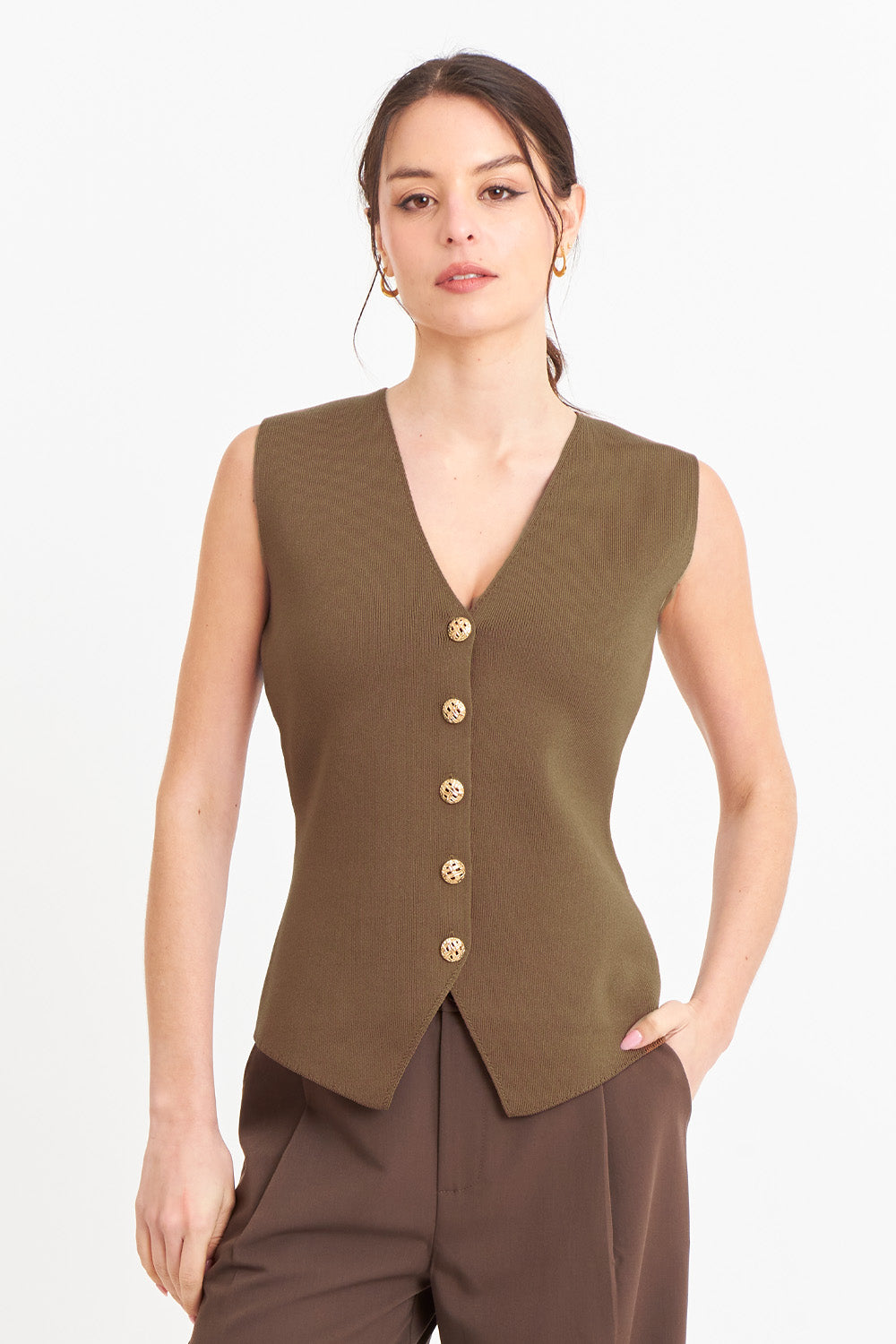 Características: Gilet de hilo con escote cruzado. Dos botones dorados funcionales para su ajuste.