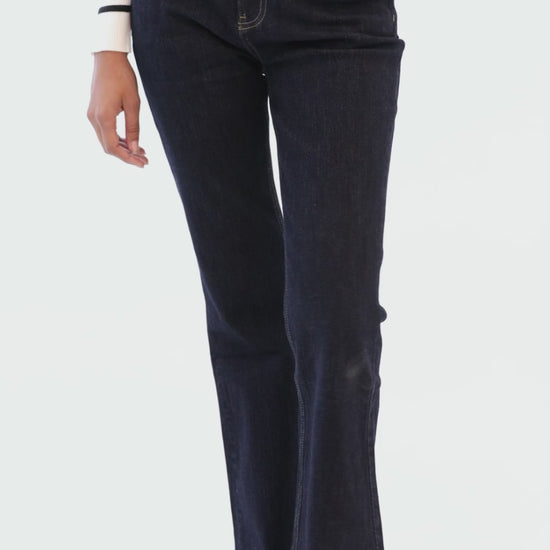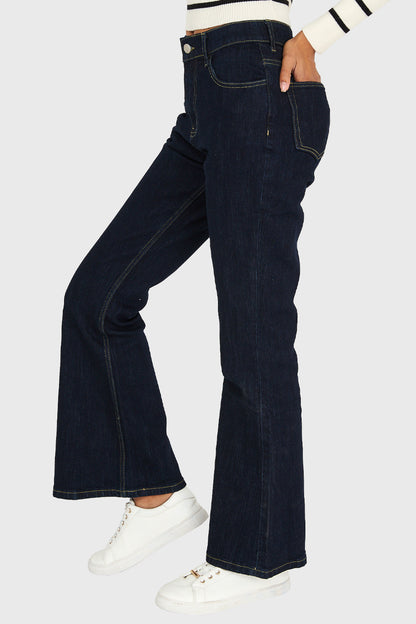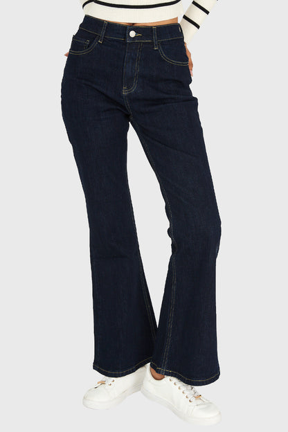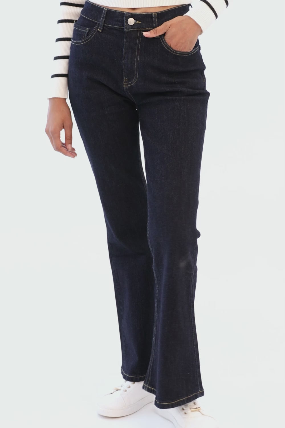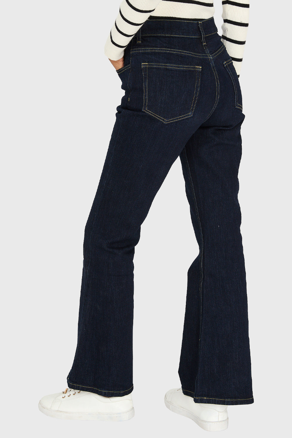 Características: Jeans pierna flare. Bolsillos funcionales delanteros y traseros. Cierre y botón de ajuste.