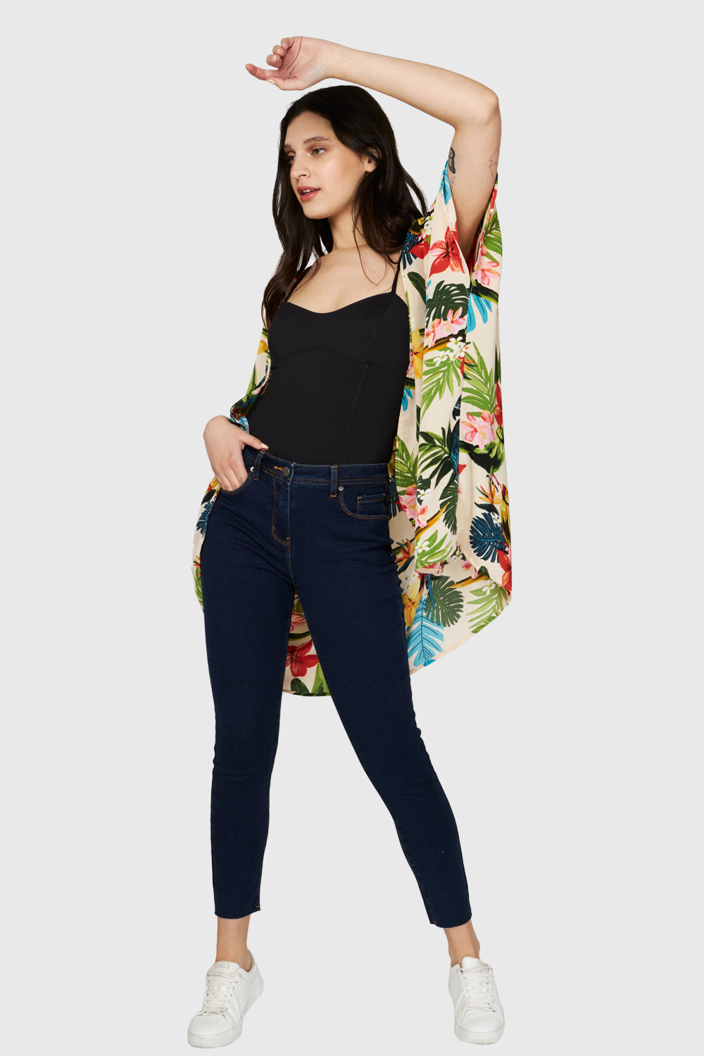 Características: Kimono estampado selva tropical con aves tipo guacamayos. Manga corta. Viene en dos tallas S/M y M/L.