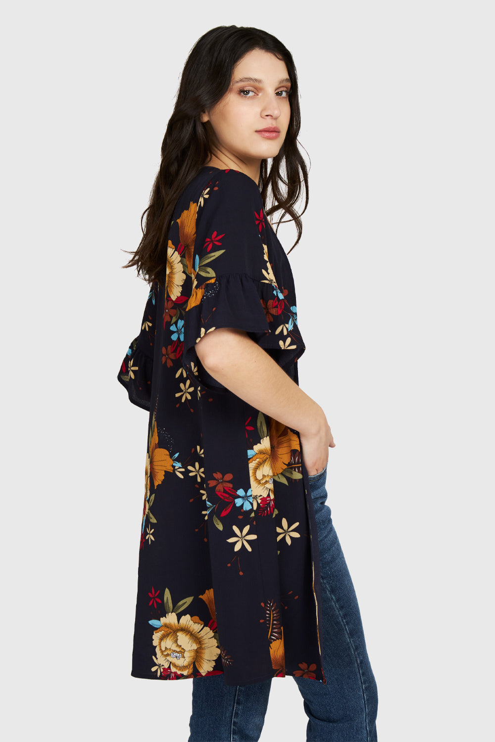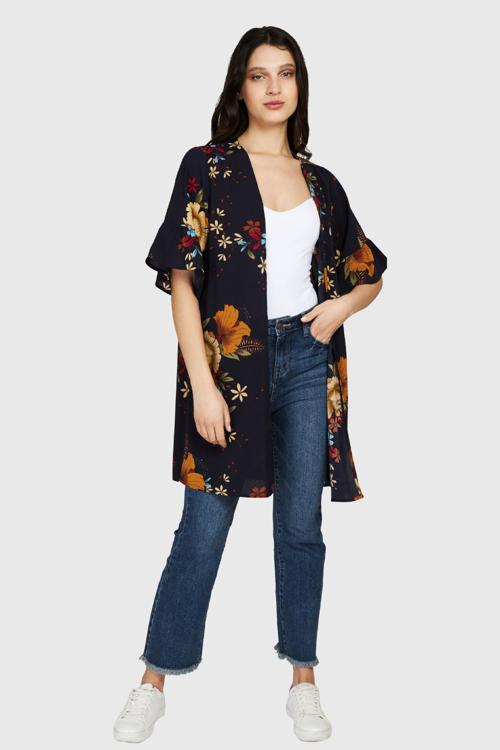 Características: Kimono con estampado de flores. Mangas corta con vuelos. Viene en dos tallas S/M y M/L.