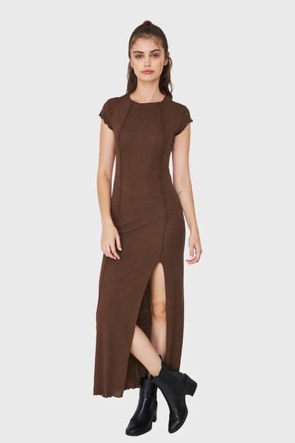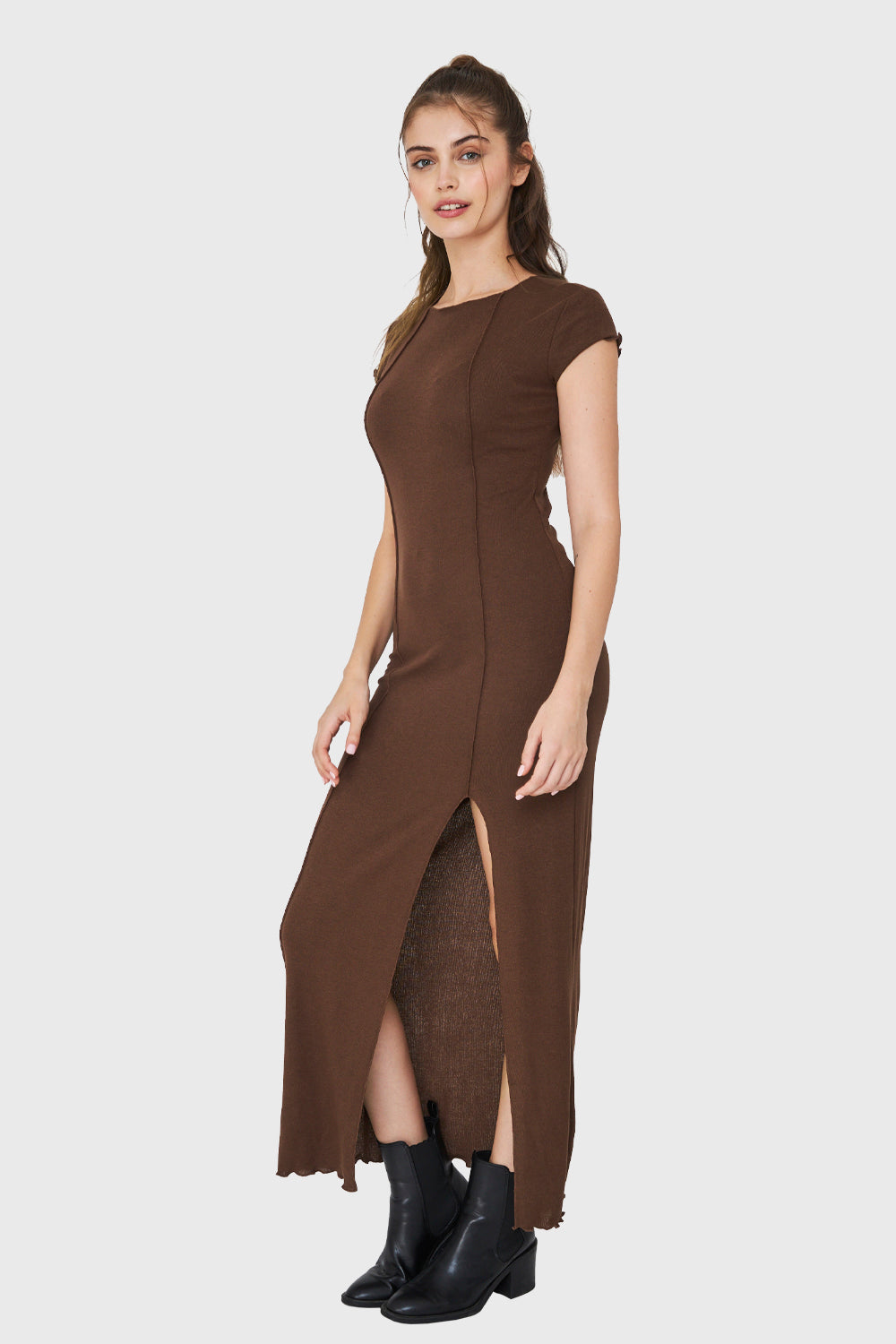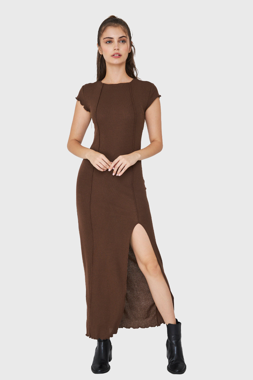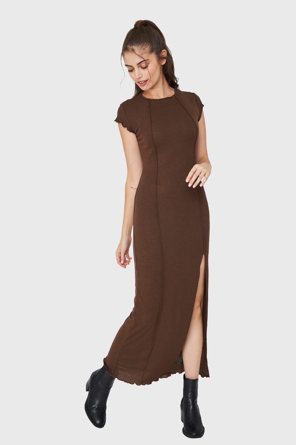 Características: Maxi vestido con tajo lateral manga corta. Tela efecto brillos. Posee costuras frontales y una en la parte posterior.