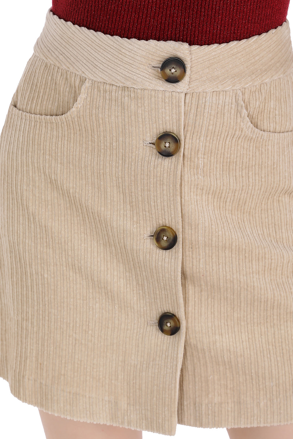 Características: Mini falda cotelé con botones de ajuste y bolsillos frontales.