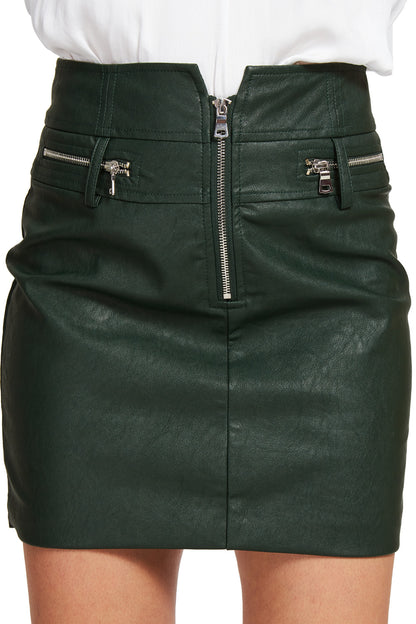 Características: Mini falda ecocuero con cierre frontal y bolsillos decorativos con cierre y presilla. Posee forro pegado a la falda.