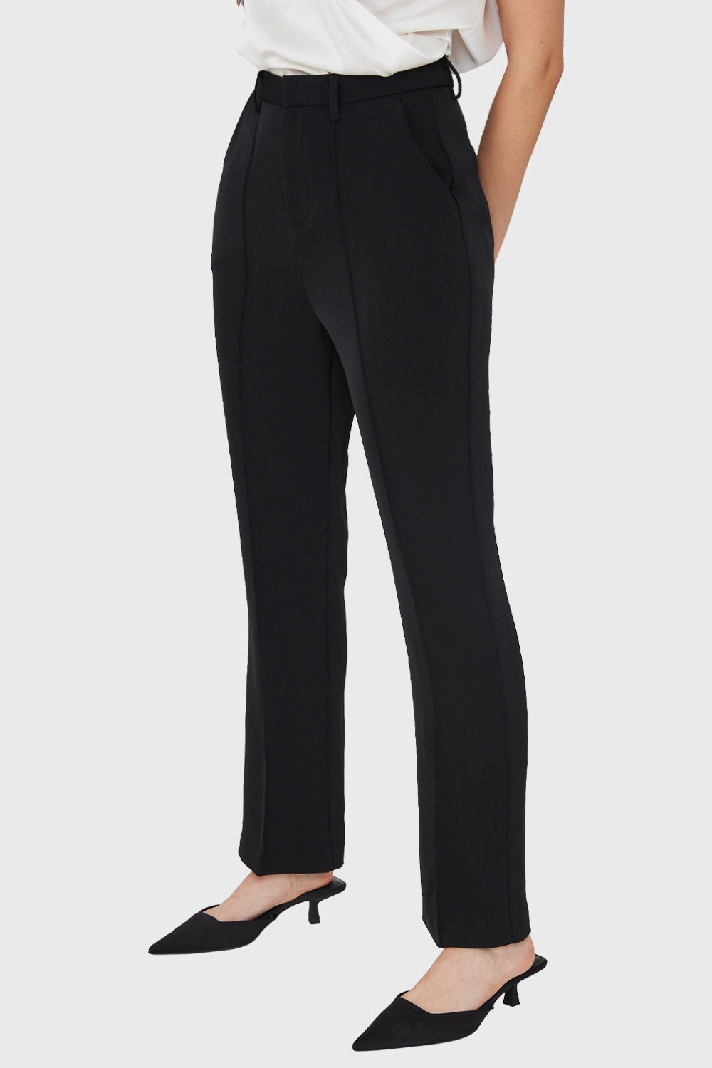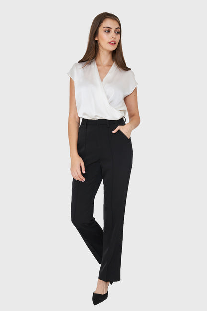 Características: Pantalón recto tiro alto con costuras frontales y bolsillos laterales. Cierre, broche y botón interno de ajuste.