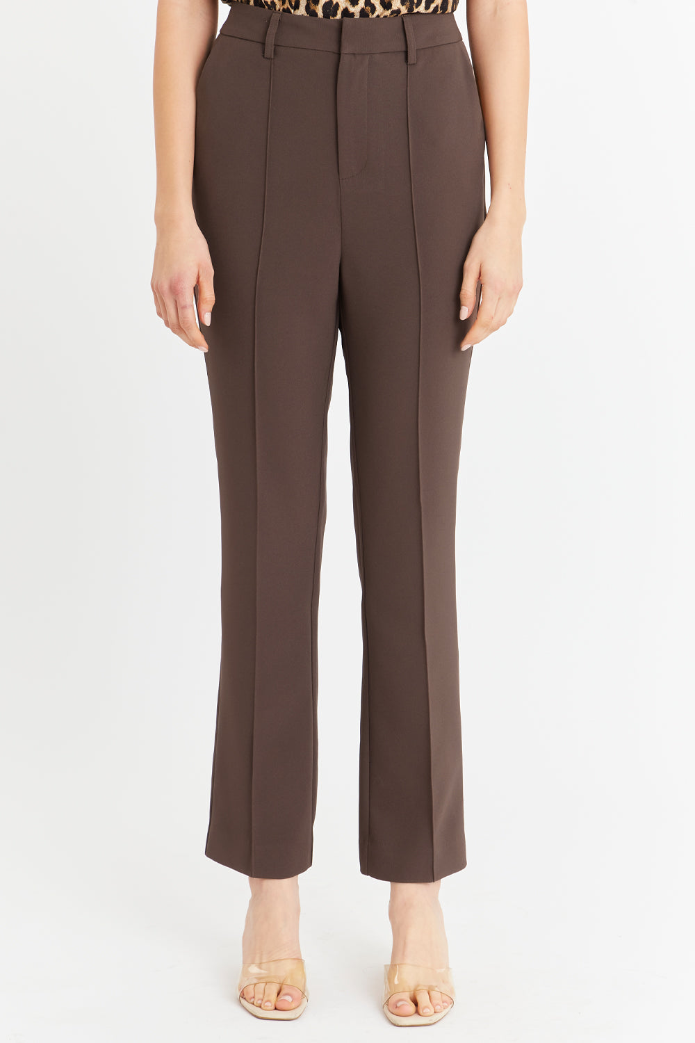 Características: Pantalón recto tiro alto con costuras frontales y bolsillos laterales. Cierre, broche y botón interno de ajuste.