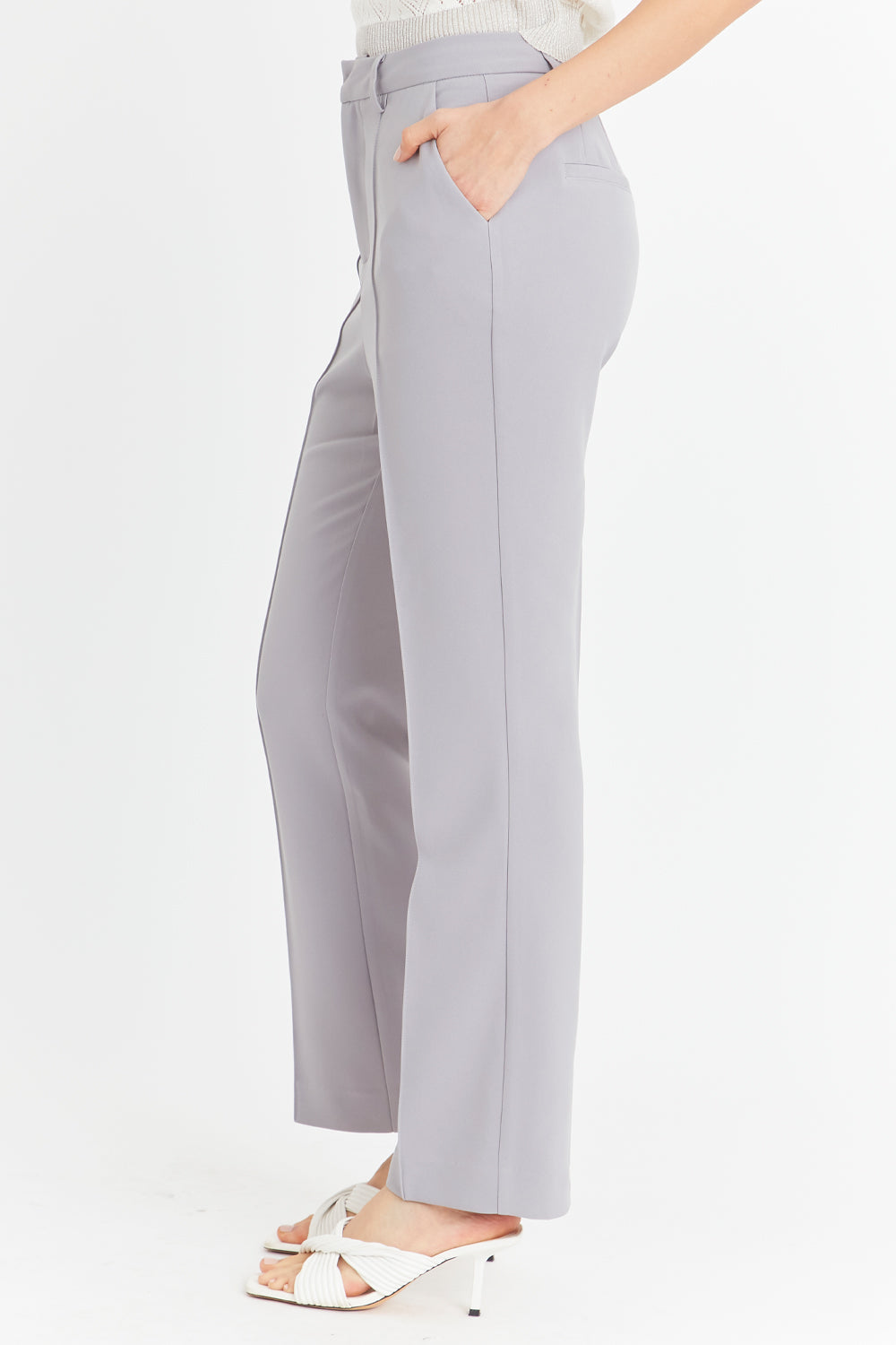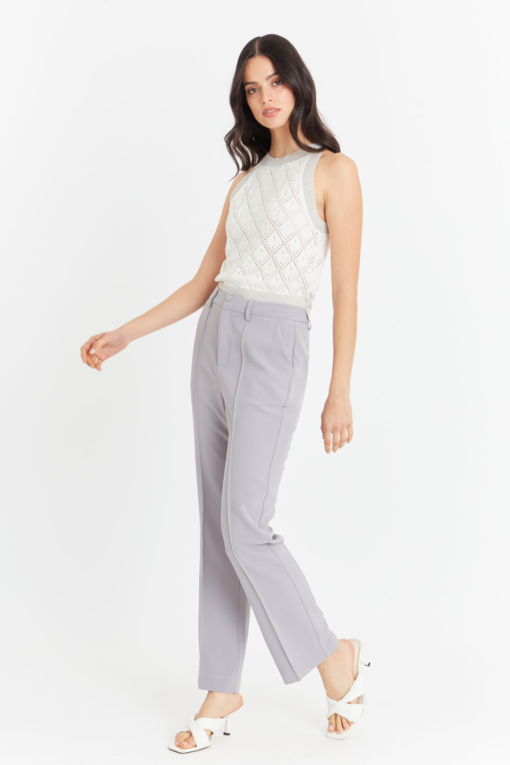 Características: Pantalón recto tiro alto con costuras frontales y bolsillos laterales. Cierre, broche y botón interno de ajuste.