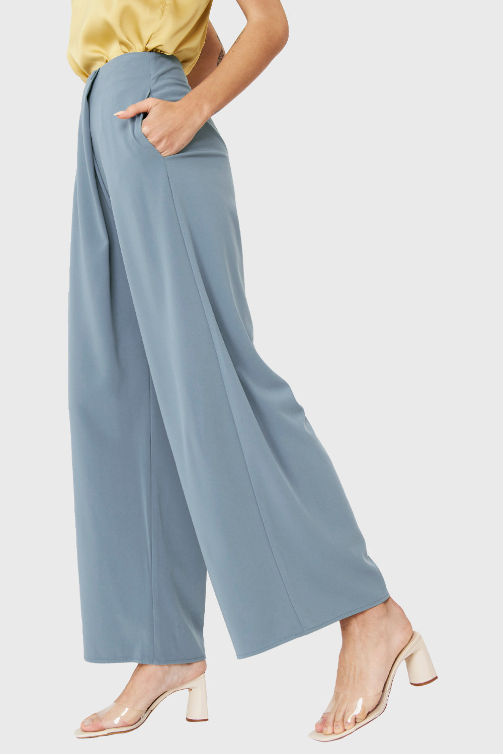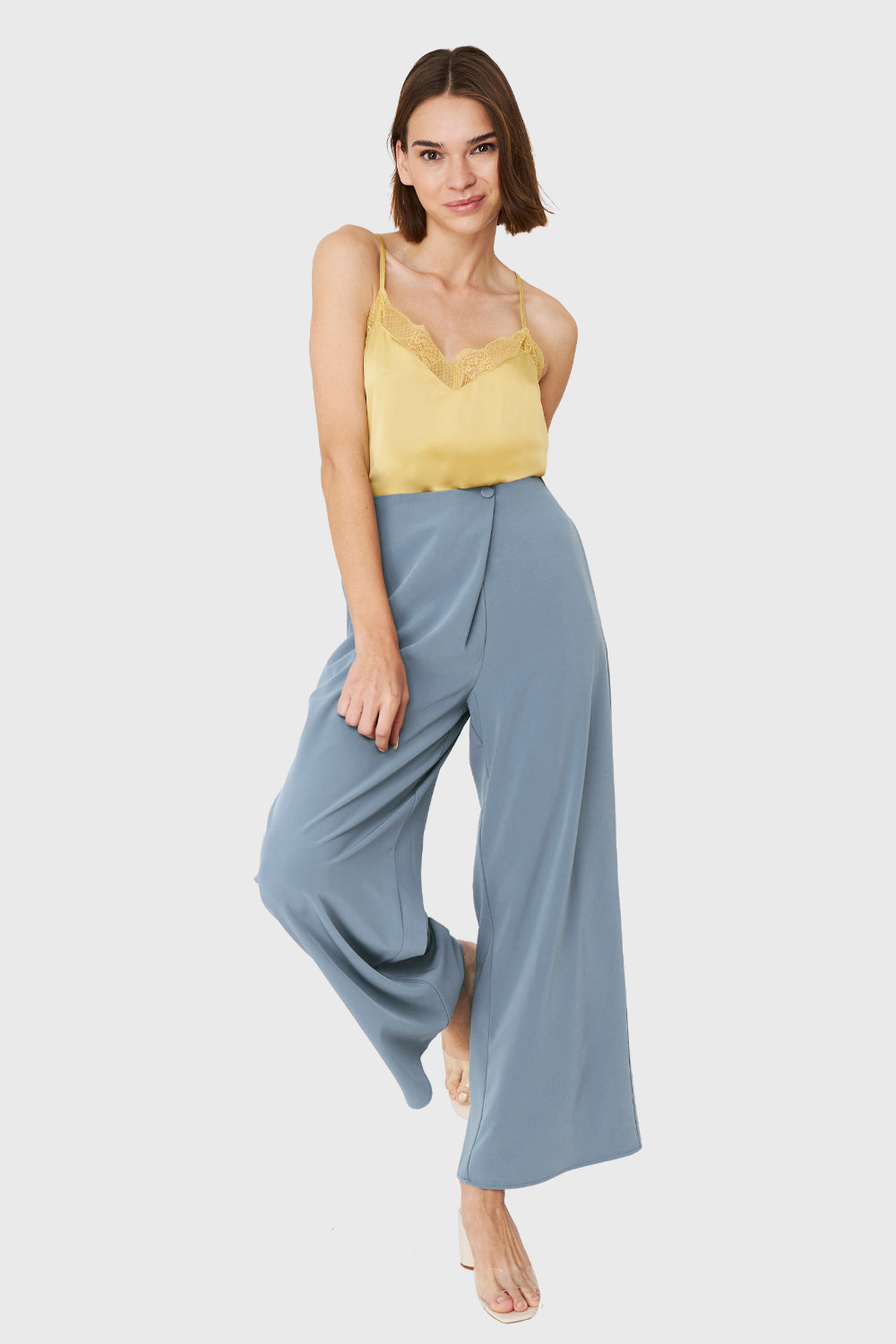Características: Pantalón palazzo tiro cruzado. Botón decorativo delantero. Cierre invisible en la espalda. Bolsillos funcionales.
