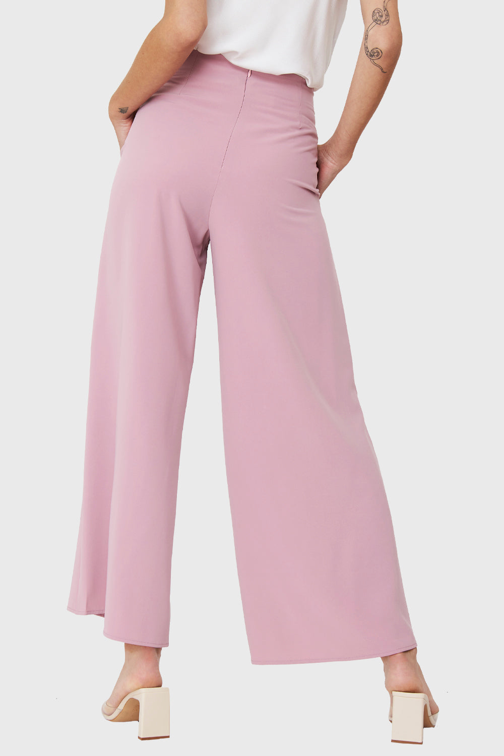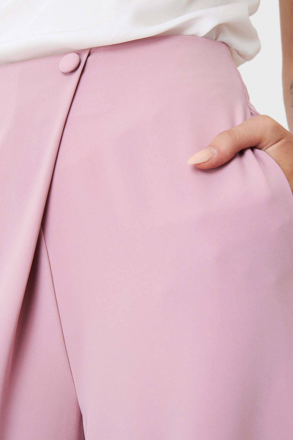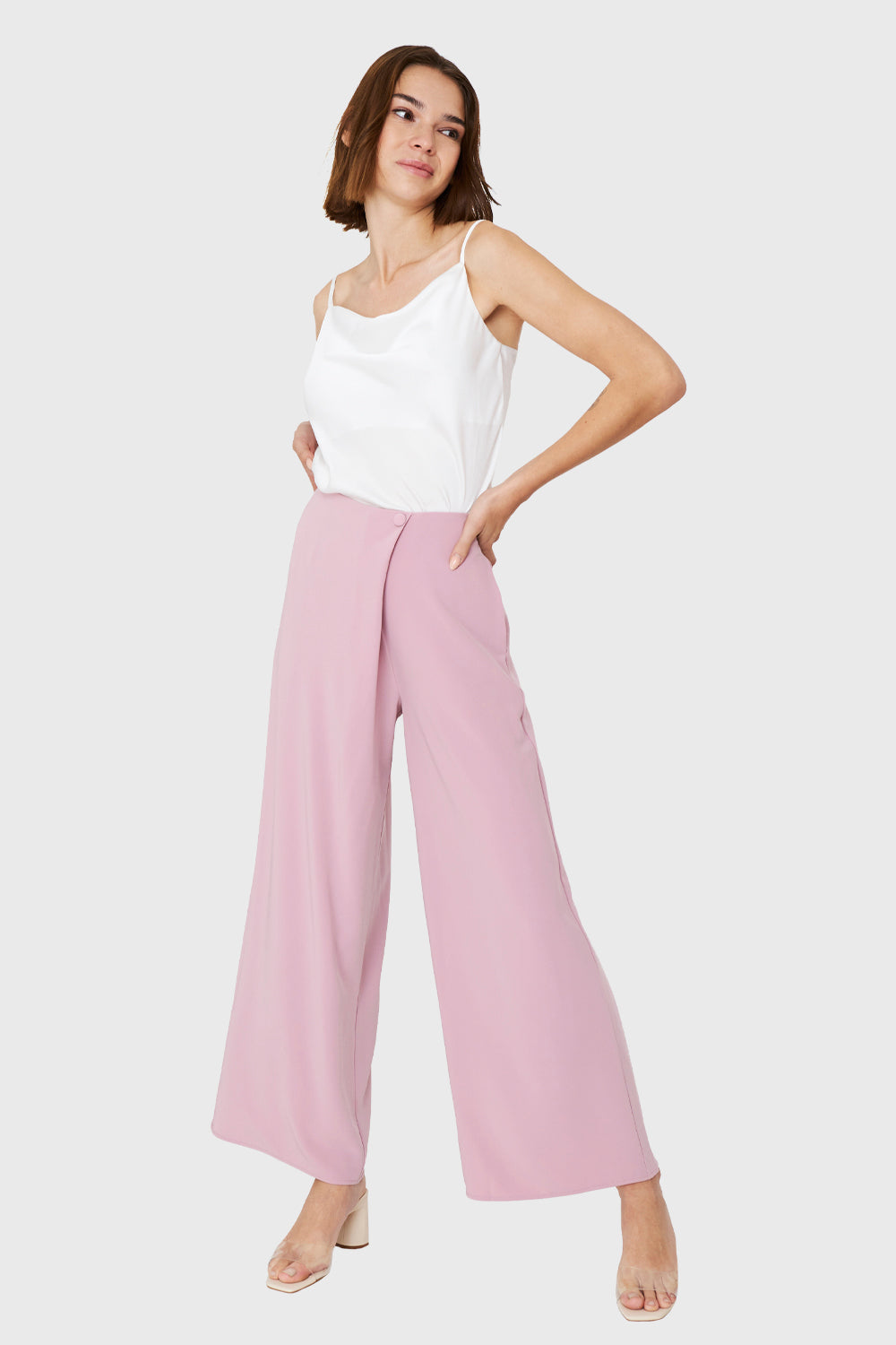 Características: Pantalón palazzo tiro cruzado. Botón decorativo delantero. Cierre invisible en la espalda. Bolsillos funcionales.