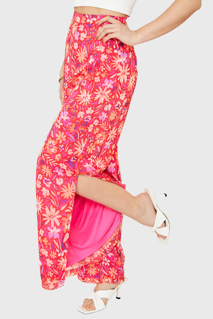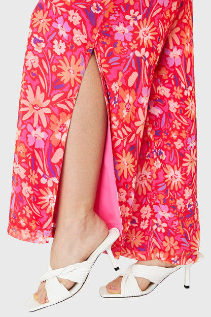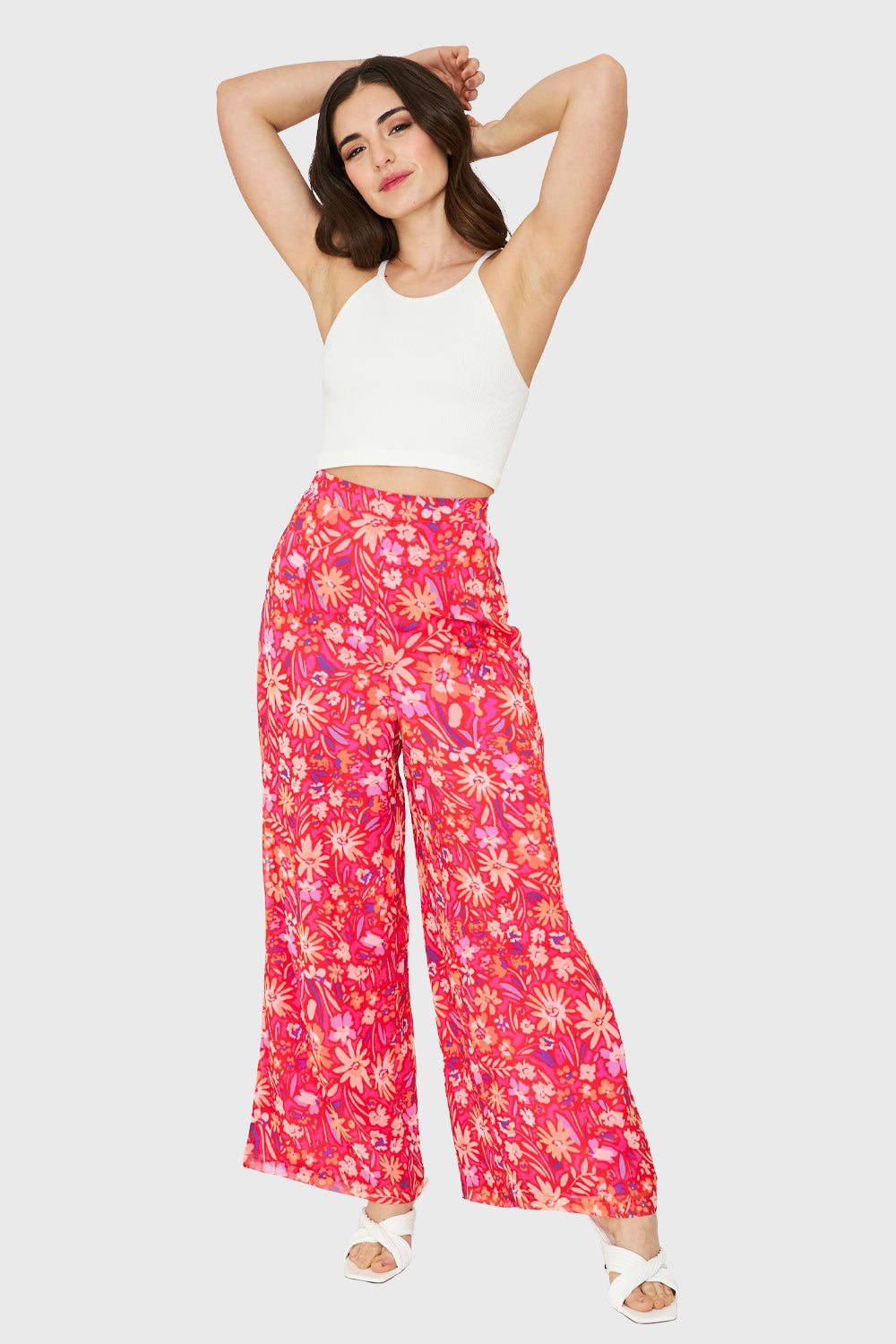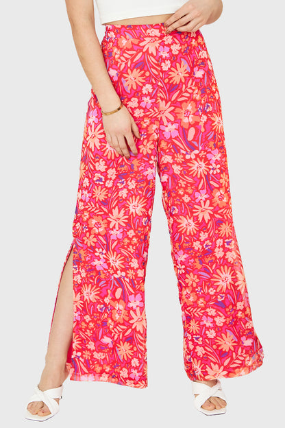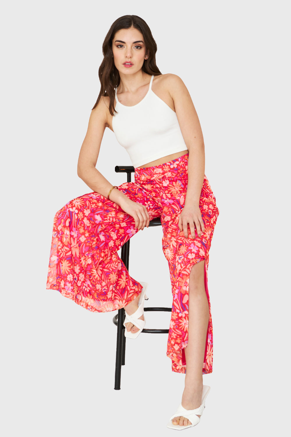 Características: Pantalón palazzo floral con tajos laterales que parten de la rodilla. Tiro alto, con cierre en la parte posterior. Forrado.