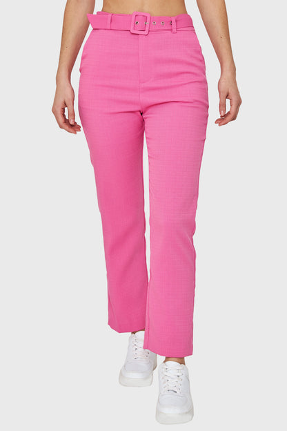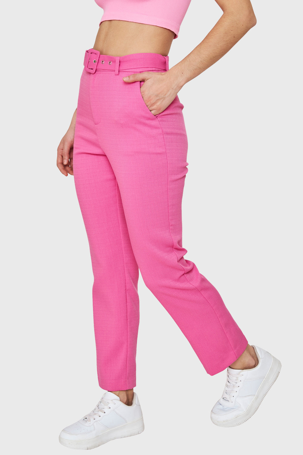 Características: Pantalón recto con cinturón con hebilla rectangular para ajuste. Cierre y broches frontales. Bolsillos laterales.