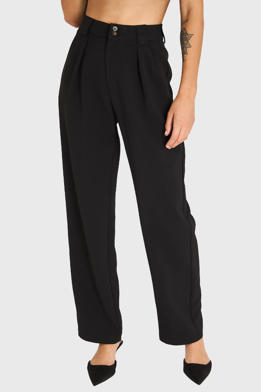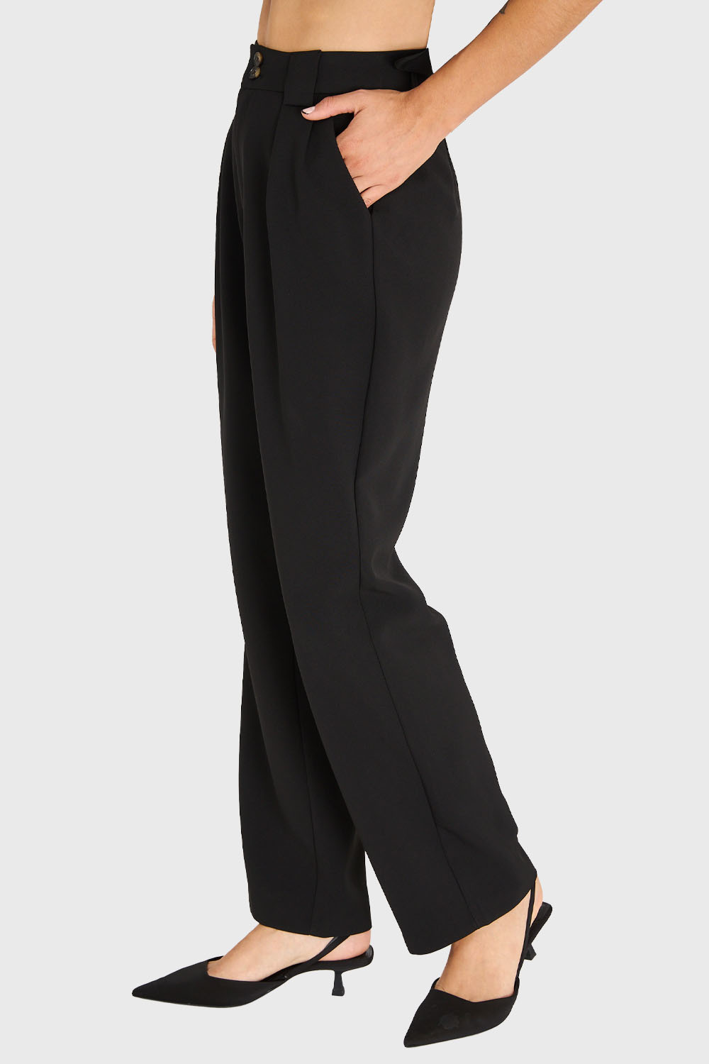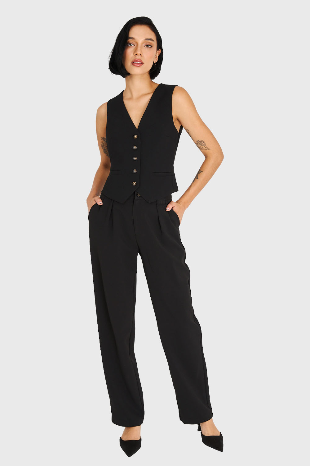 Características: Pantalón recto con bolsillos laterales. Posee presillas anchas y pinzas en la parte frontal. Tiene cierre y dos botones de ajuste.