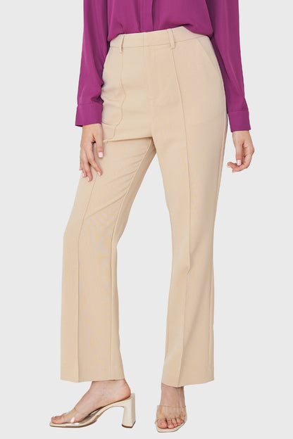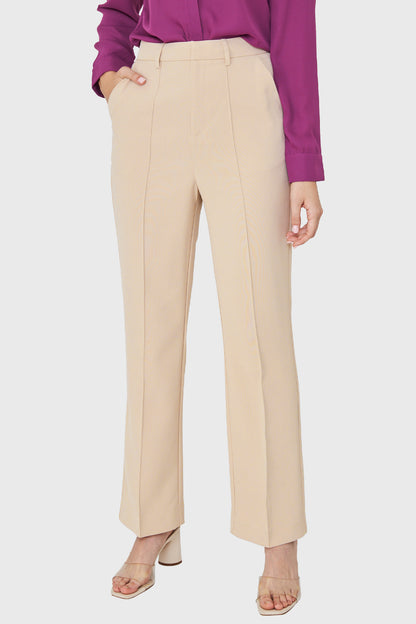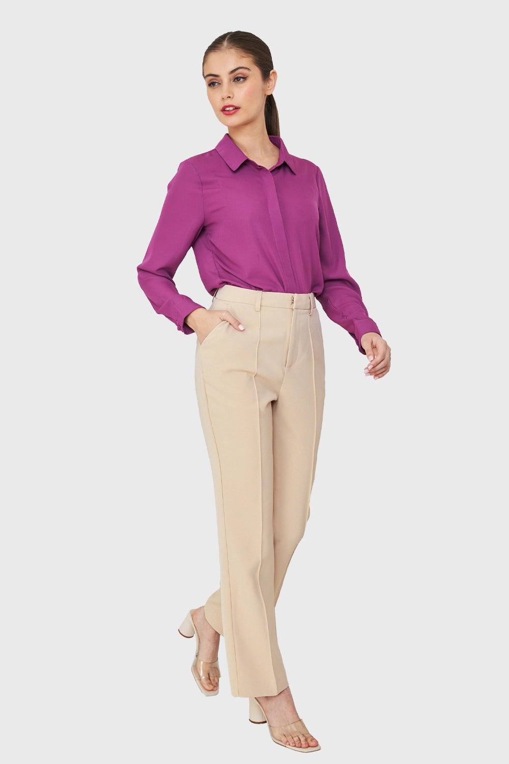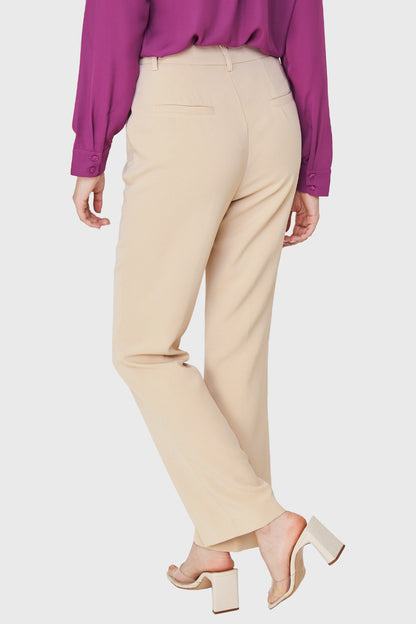 Características: Pantalón recto tiro alto con costuras frontales y bolsillos laterales. Cierre, broche y botón interno de ajuste.