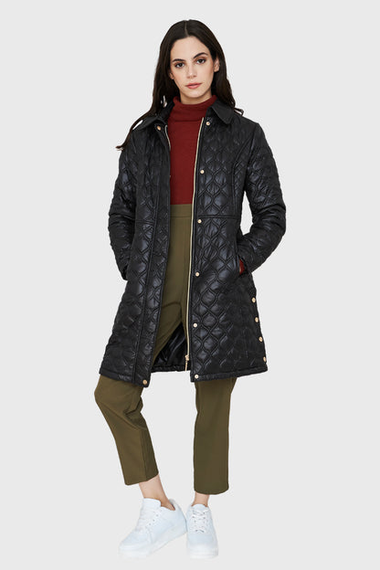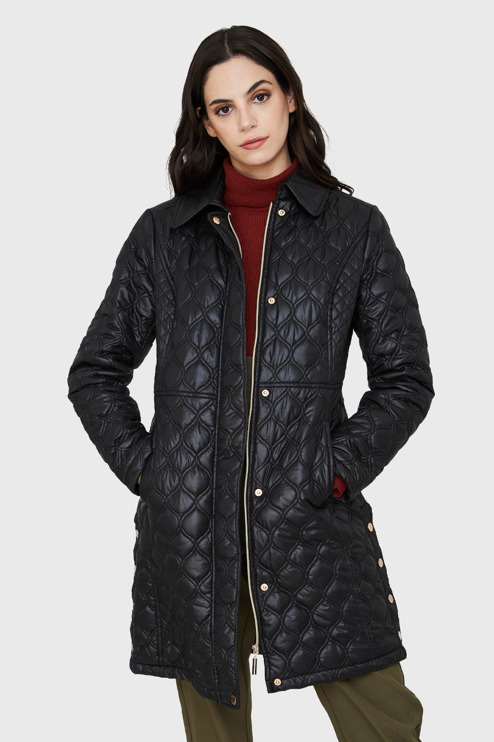Características: Parka larga cuello camisero, con cierre frontal y broches. Posee bolsillos frontales y broches decorativos a los costados.