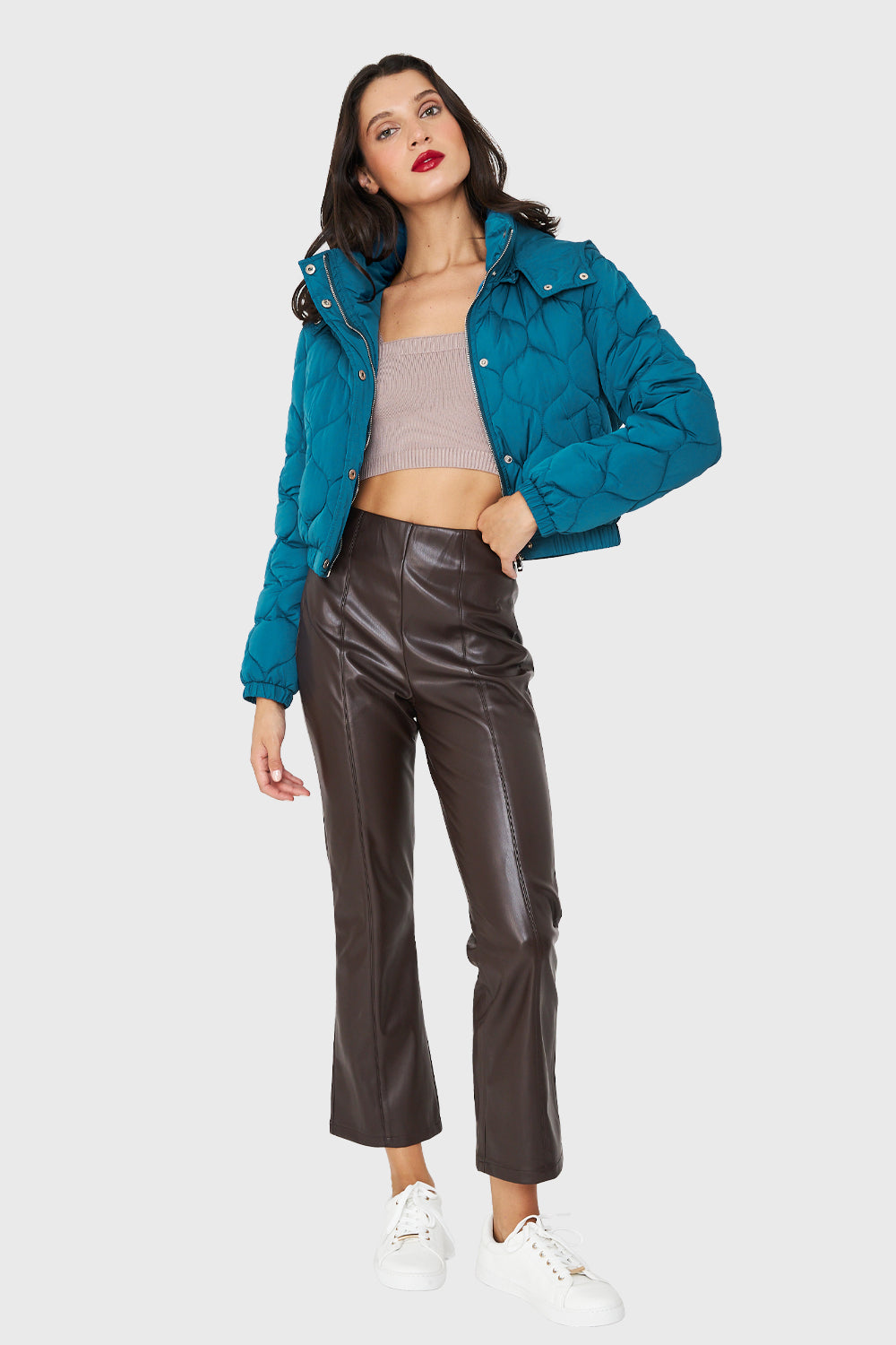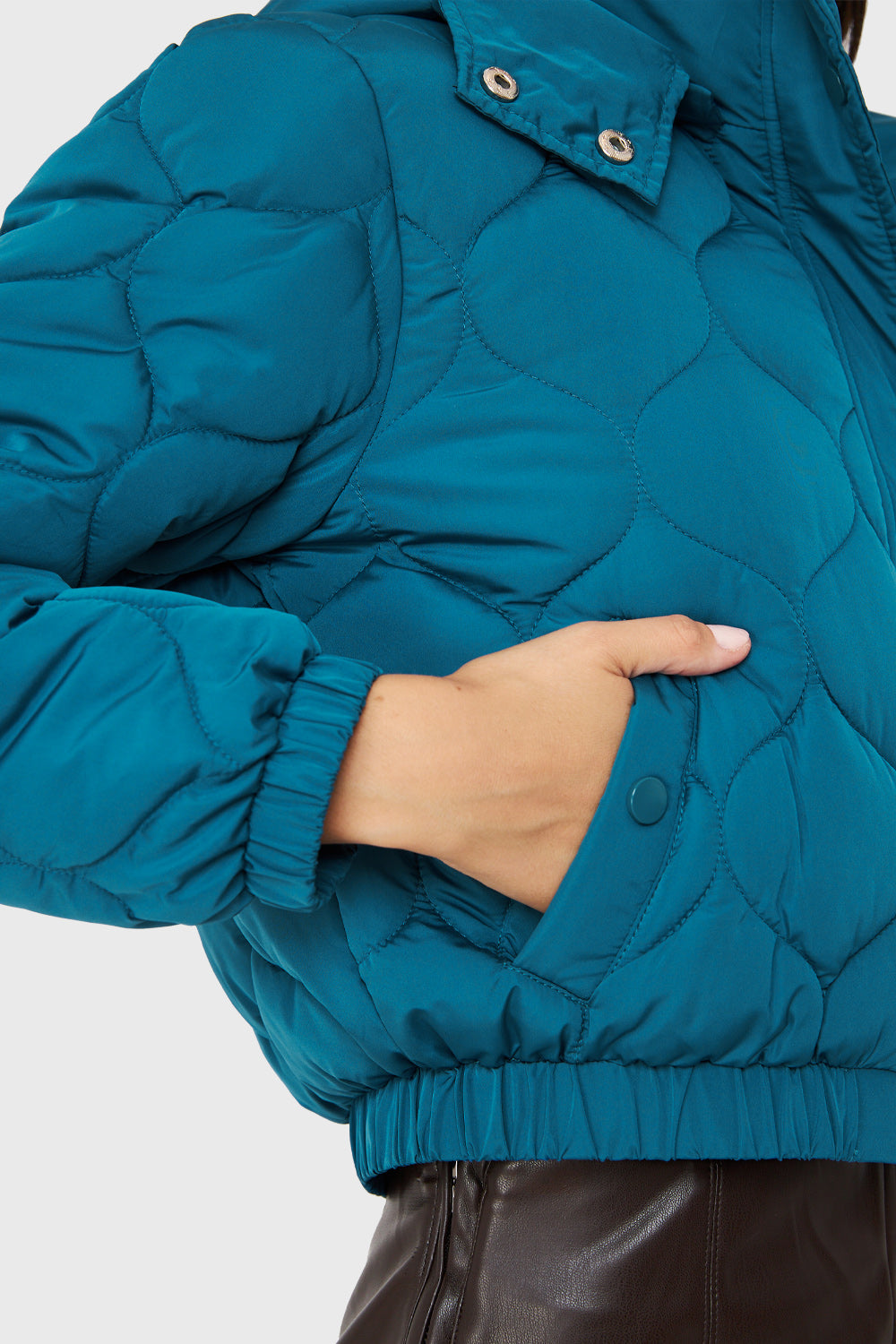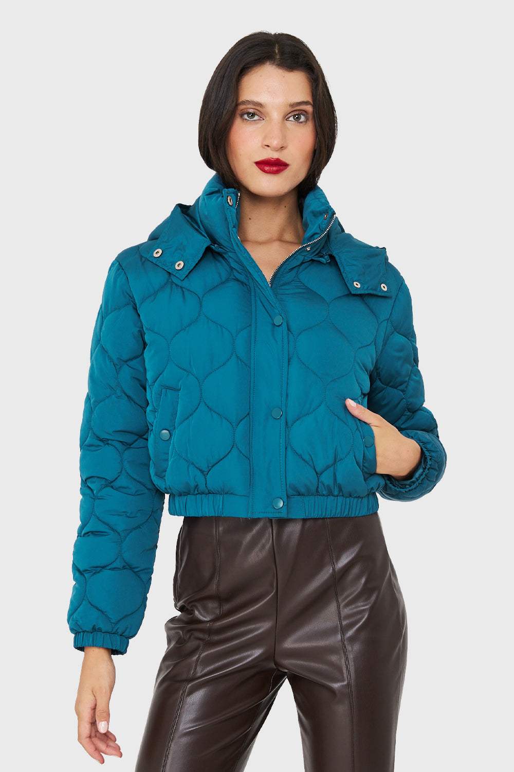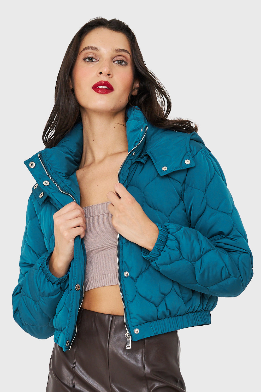 Características: Parka corta tipo quilt con cuello alto y gorro desmontable. Este posee broches para ajuste en cuello. Cuenta con pretina en puños y cintura.elasticada. Posee bolsillos funcionales con broches.