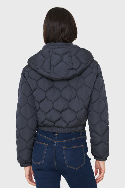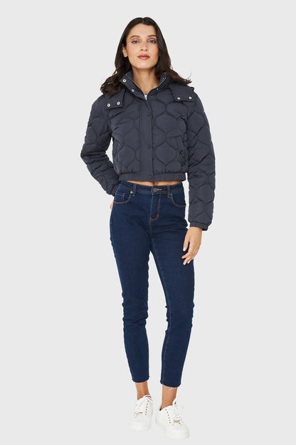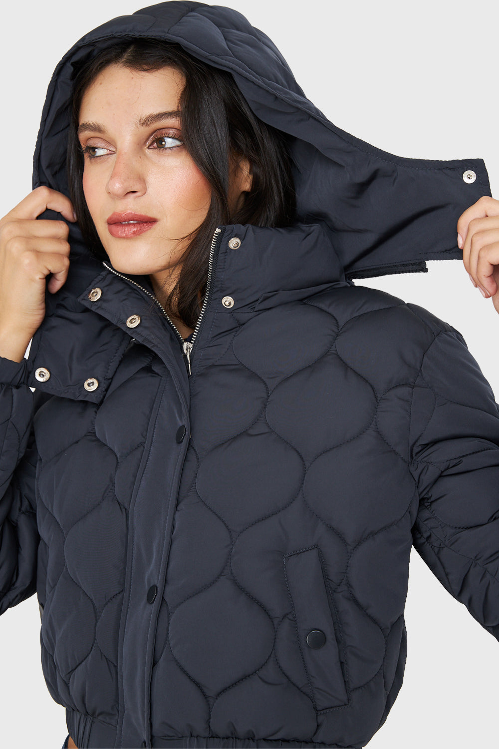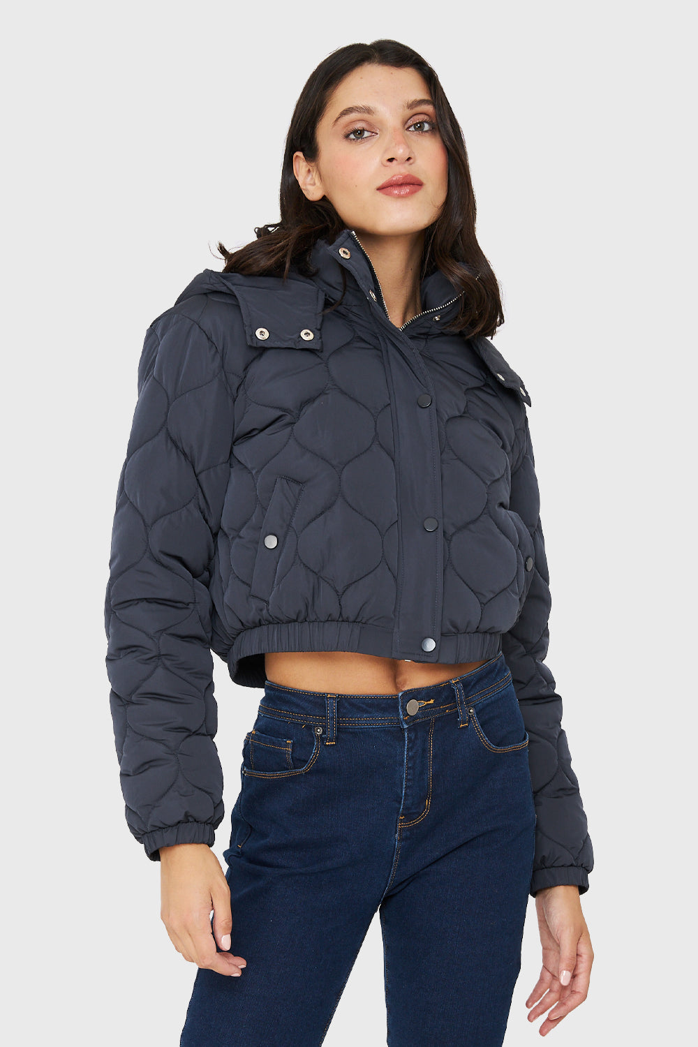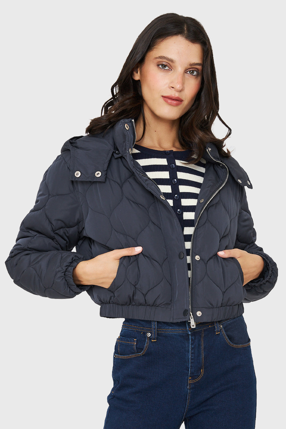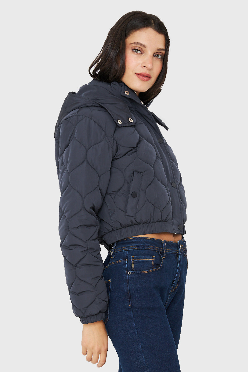 Características: Parka corta tipo quilt con cuello alto y gorro desmontable. Este posee broches para ajuste en cuello. Cuenta con pretina en puños y cintura.elasticada. Posee bolsillos funcionales con broches.