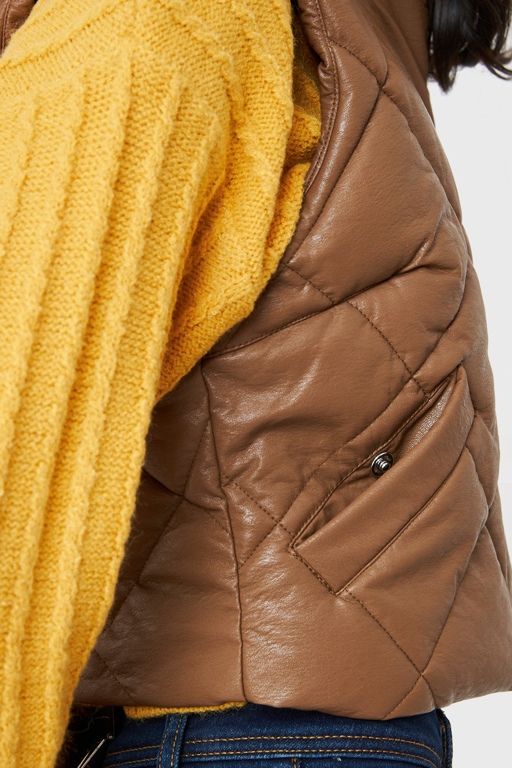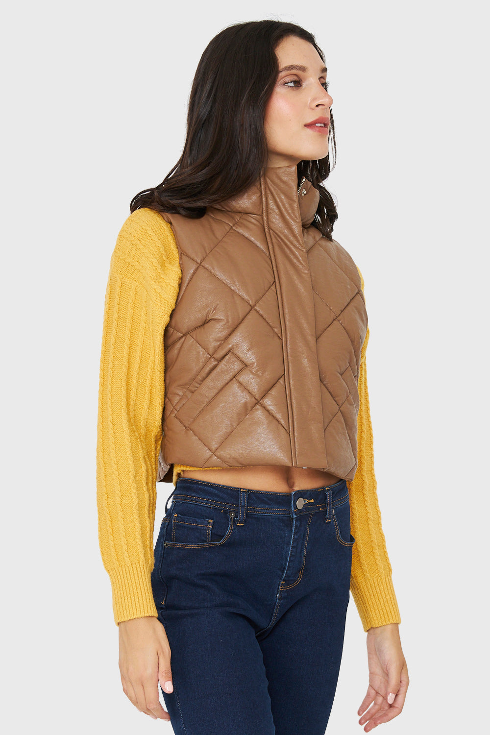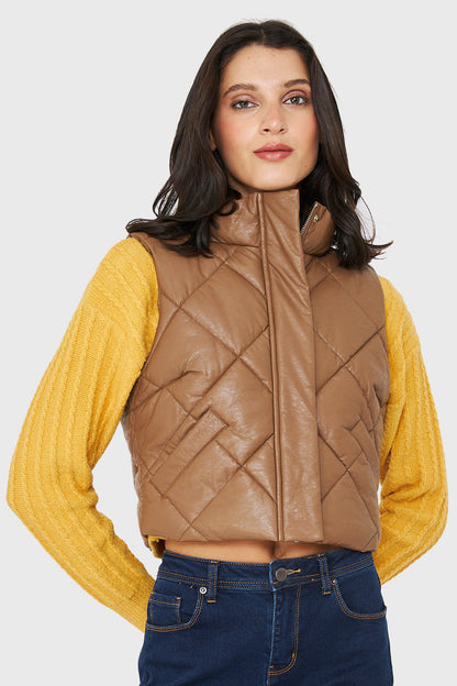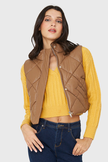 Parka Corta Sin Mangas Tipo Ecocuero Café