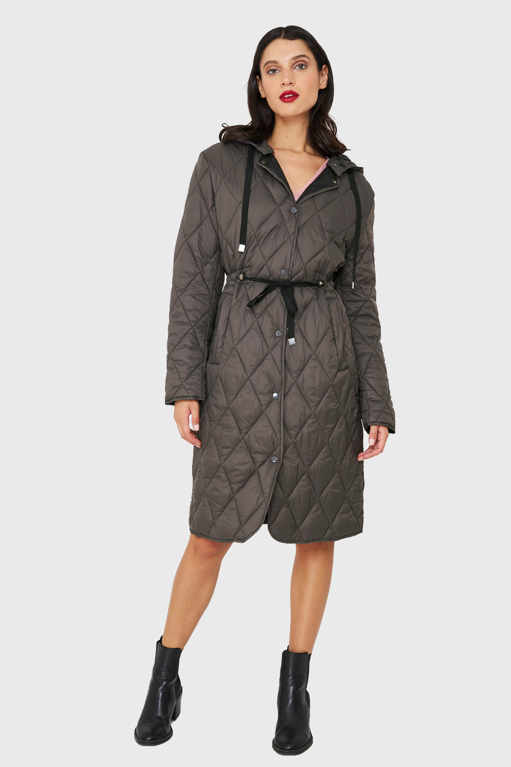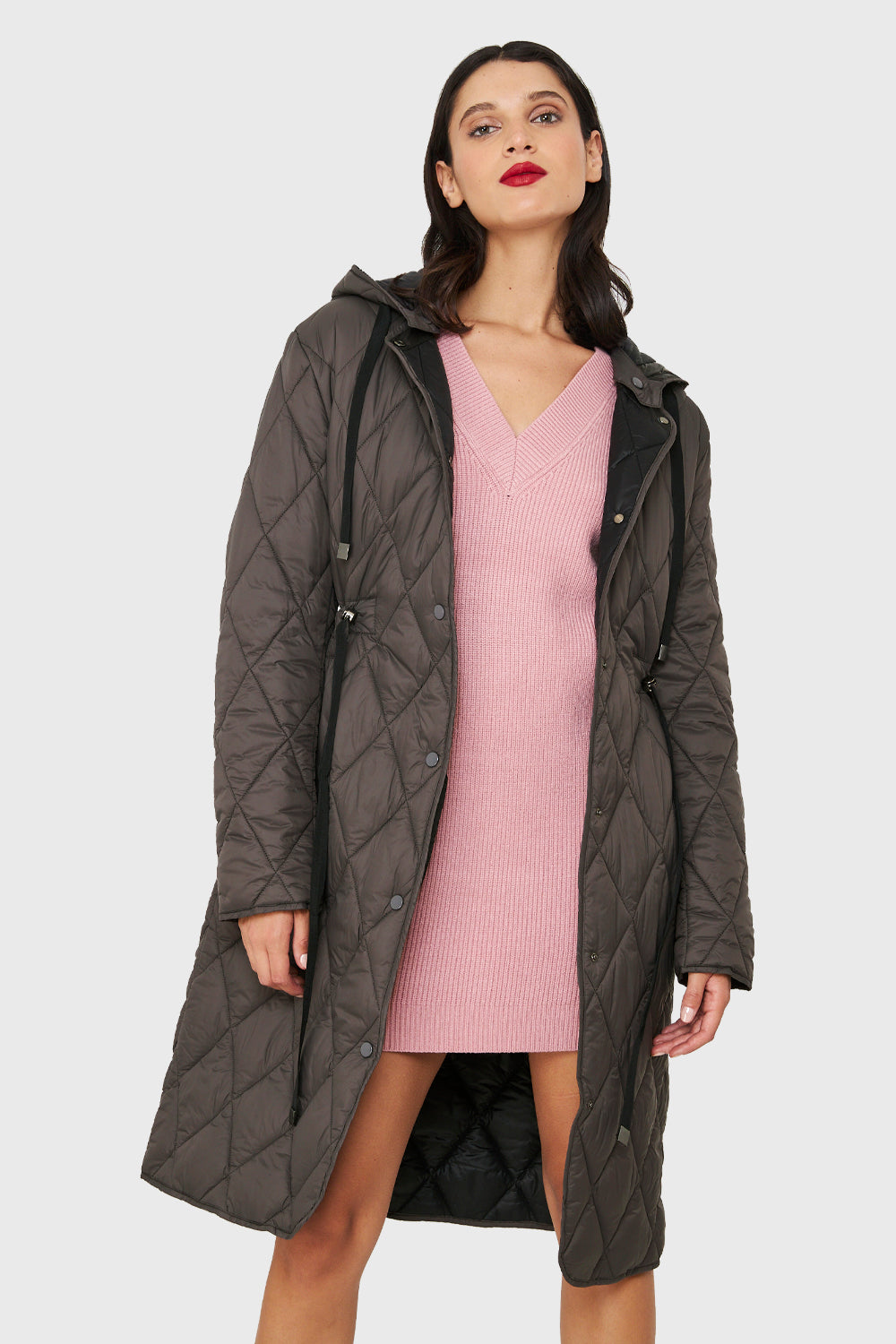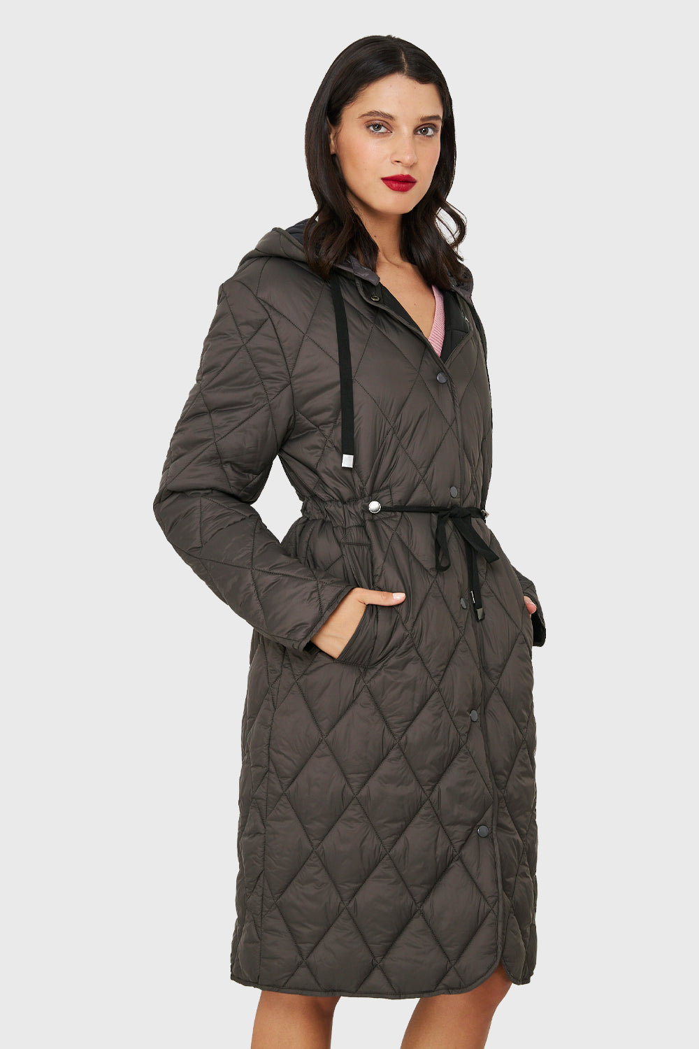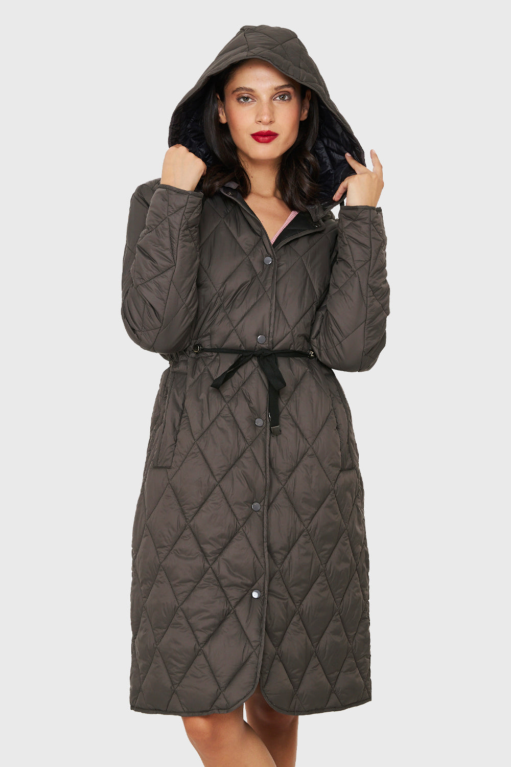 Características: Parka larga quilt cintura ajustable con lazo. Gorro desmontable con cordón ajustable y broches frontales de ajuste. Bolsillos laterales.