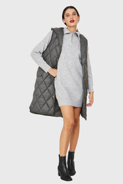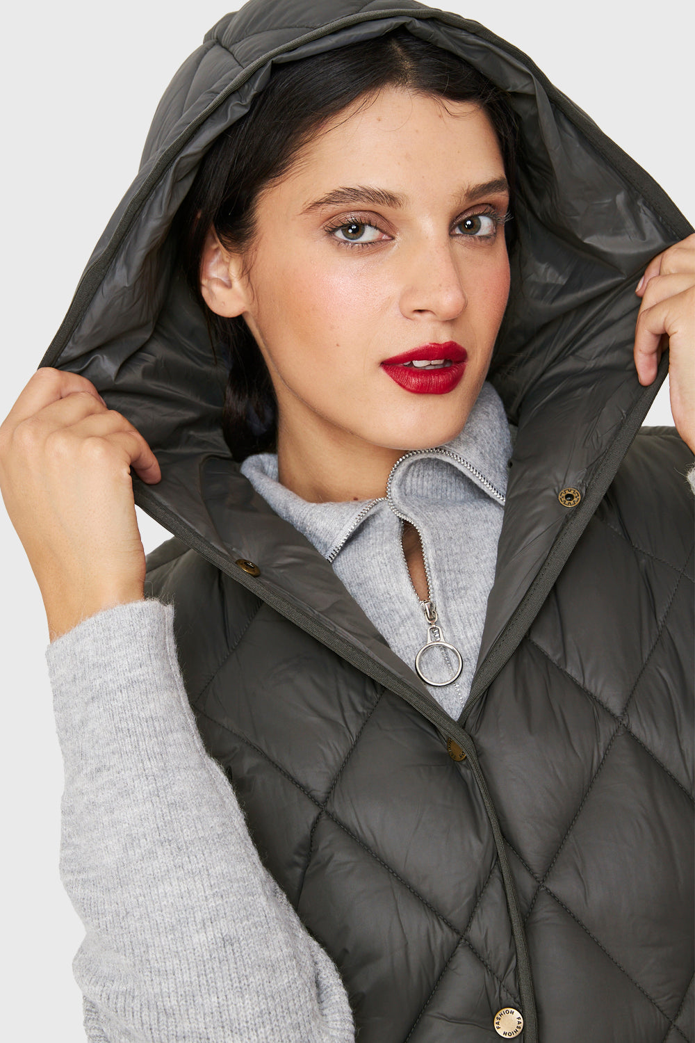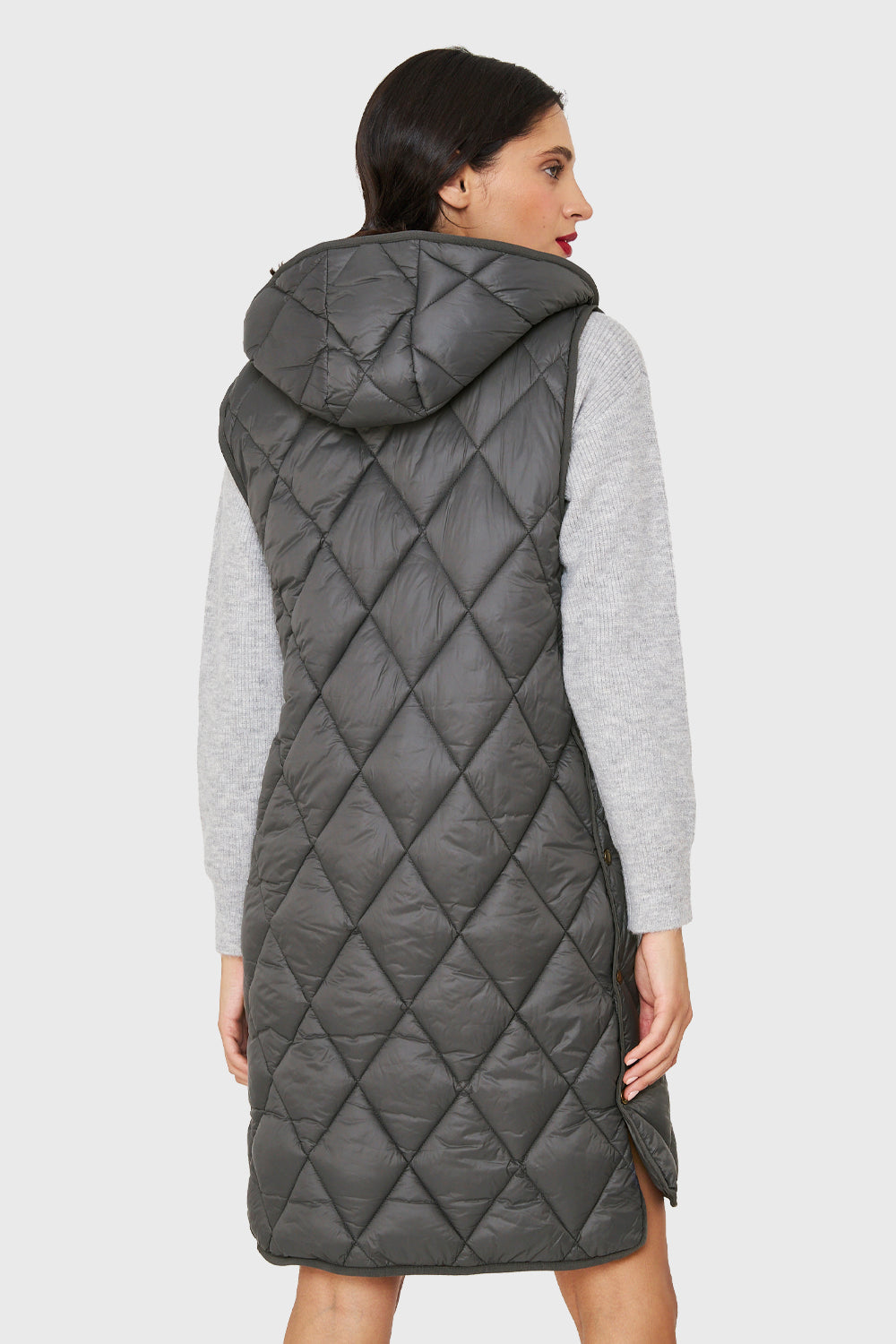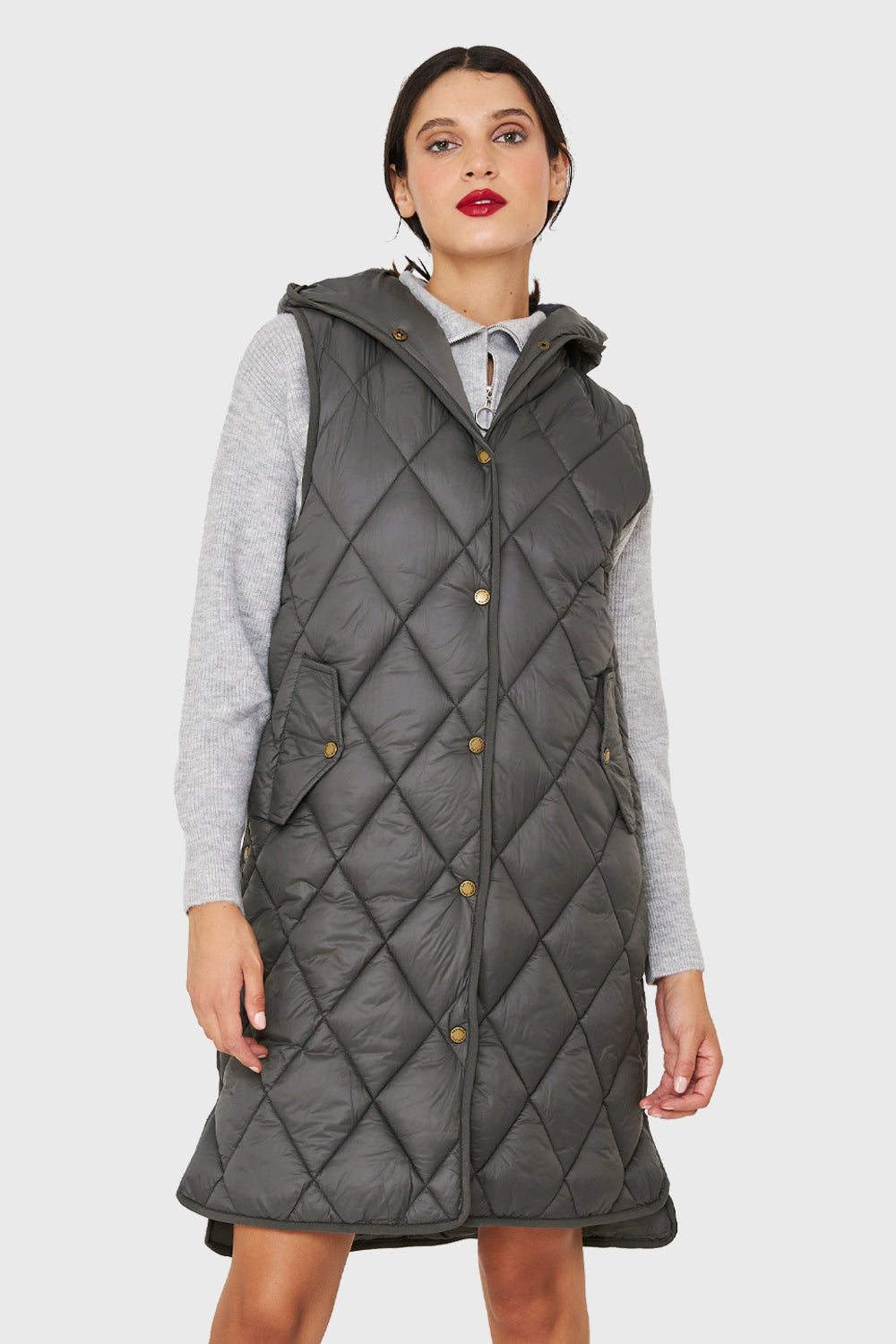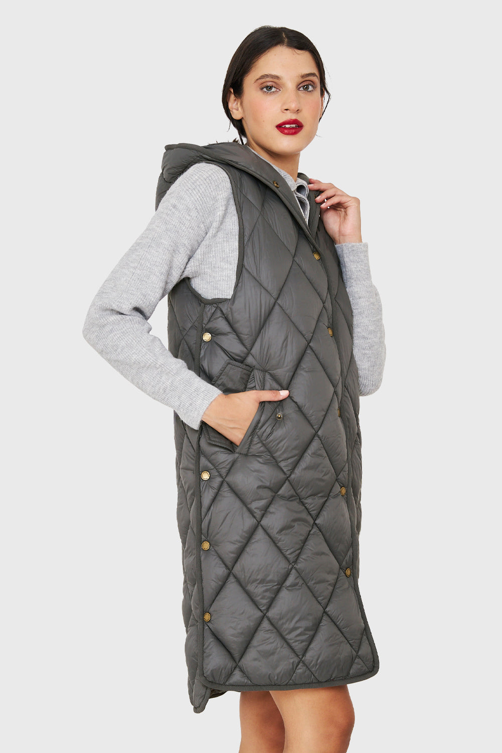 Características: Parka sin mangas tipo quilt larga con gorro. Posee broches frontals de ajuste y en sus laterales. También posee bolsillos laterales con broches.