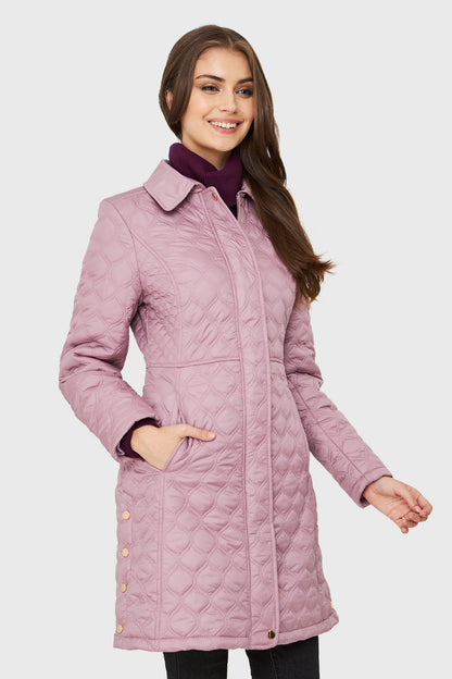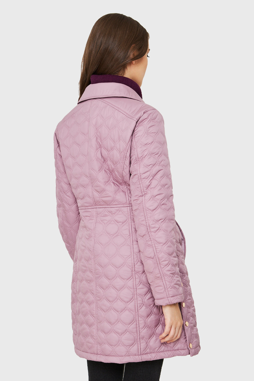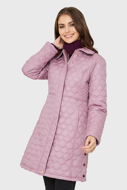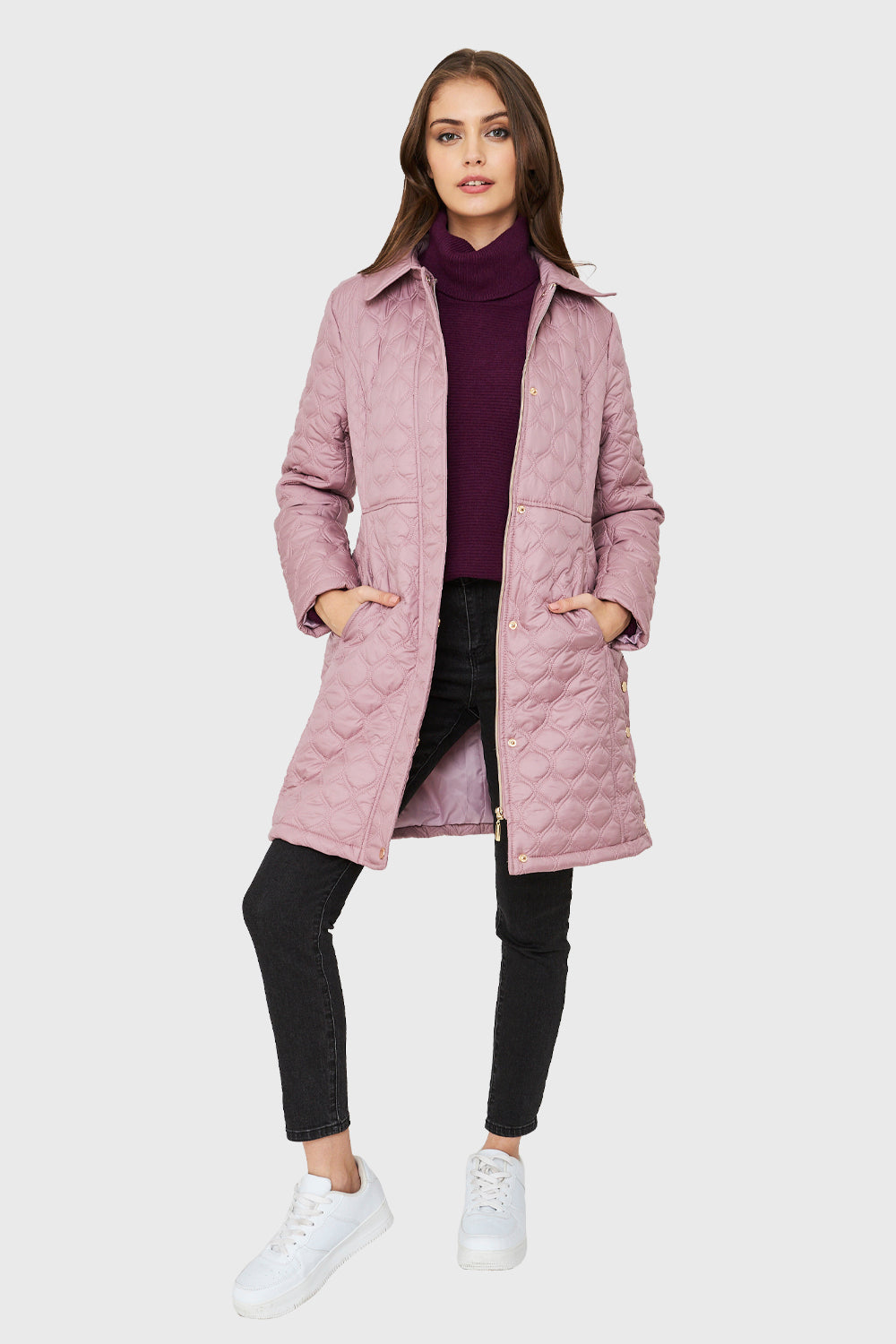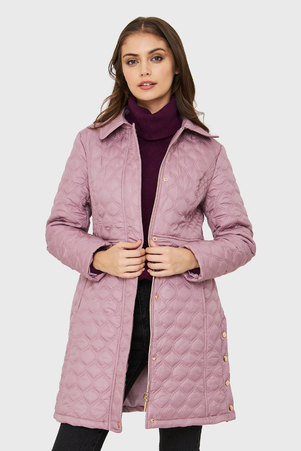 Características: Parka midi tipo quilt opaca, con cierre y broches de ajuste en la parte frontal. Cuello camisero y bolsillos laterales. También posee broches funcionales en los costados (parte baja) para mayor comodidad al sentarse.