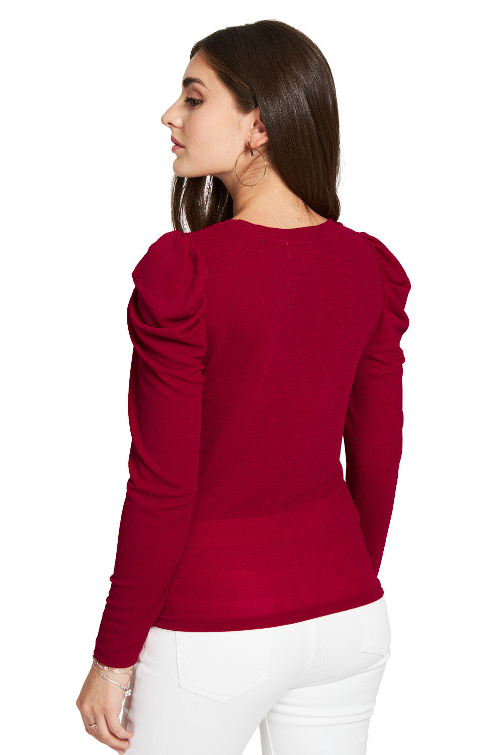 Características: Polera brillo manga drapeada cuello redondo manga larga