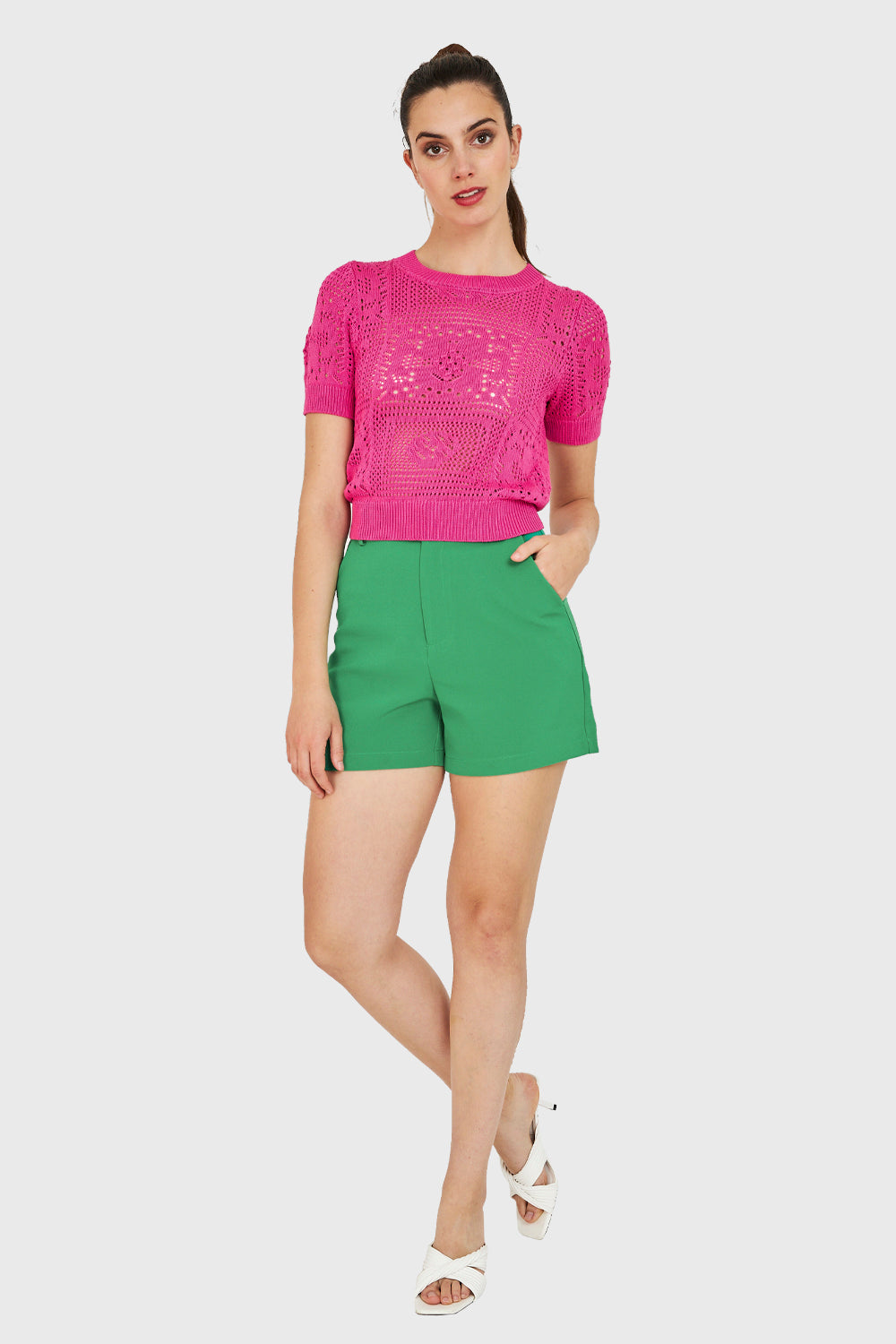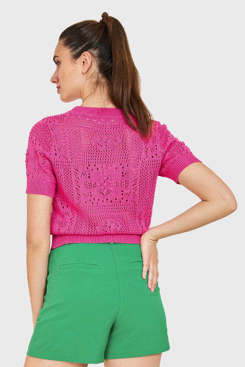 Características: Polera manga corta calada tipo tejida con cuello redondo.