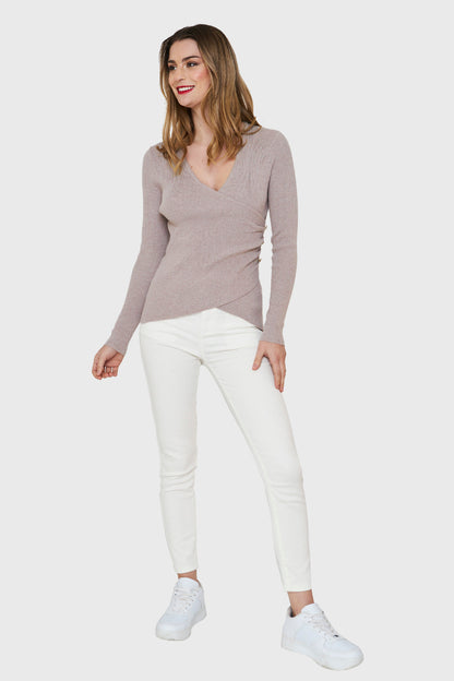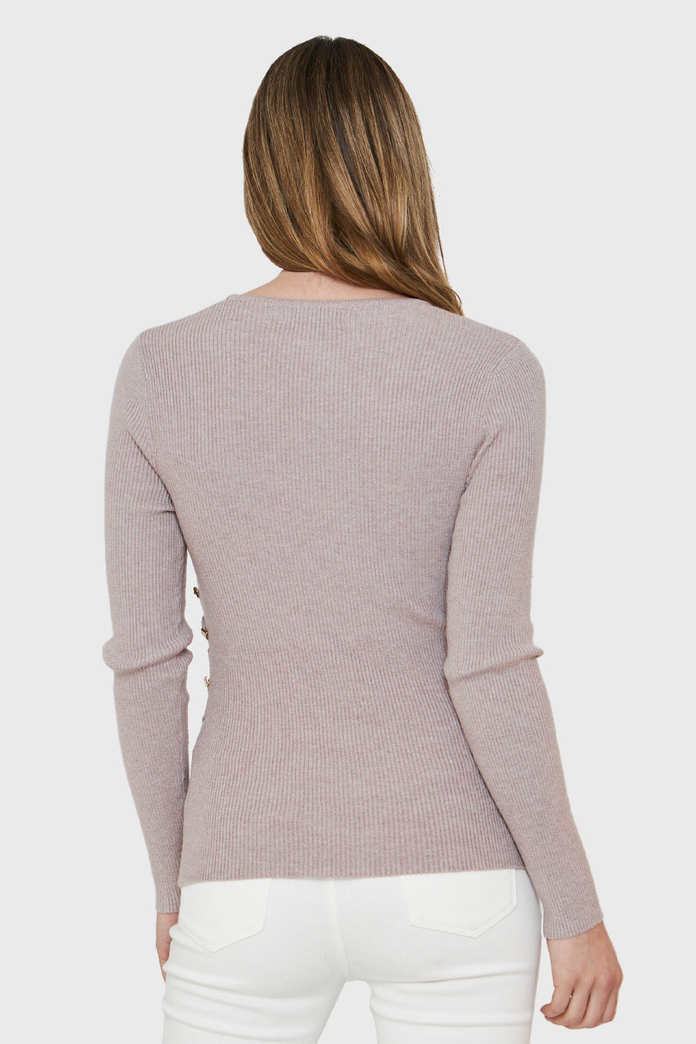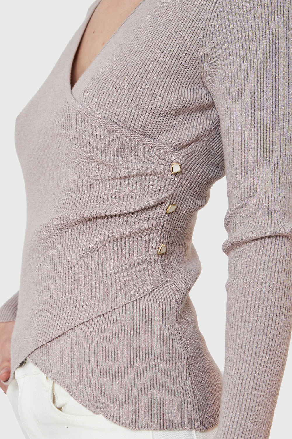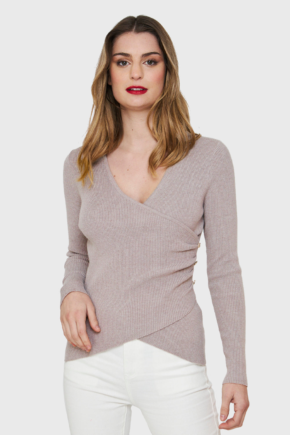 Características: Polera tipo tejido escote V cruzado. Con drapeado lateral y detalle de botones decorativos.