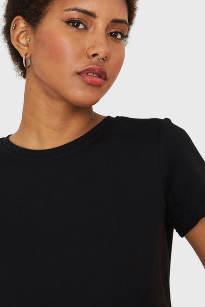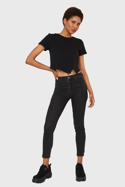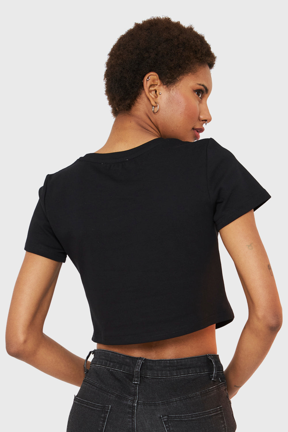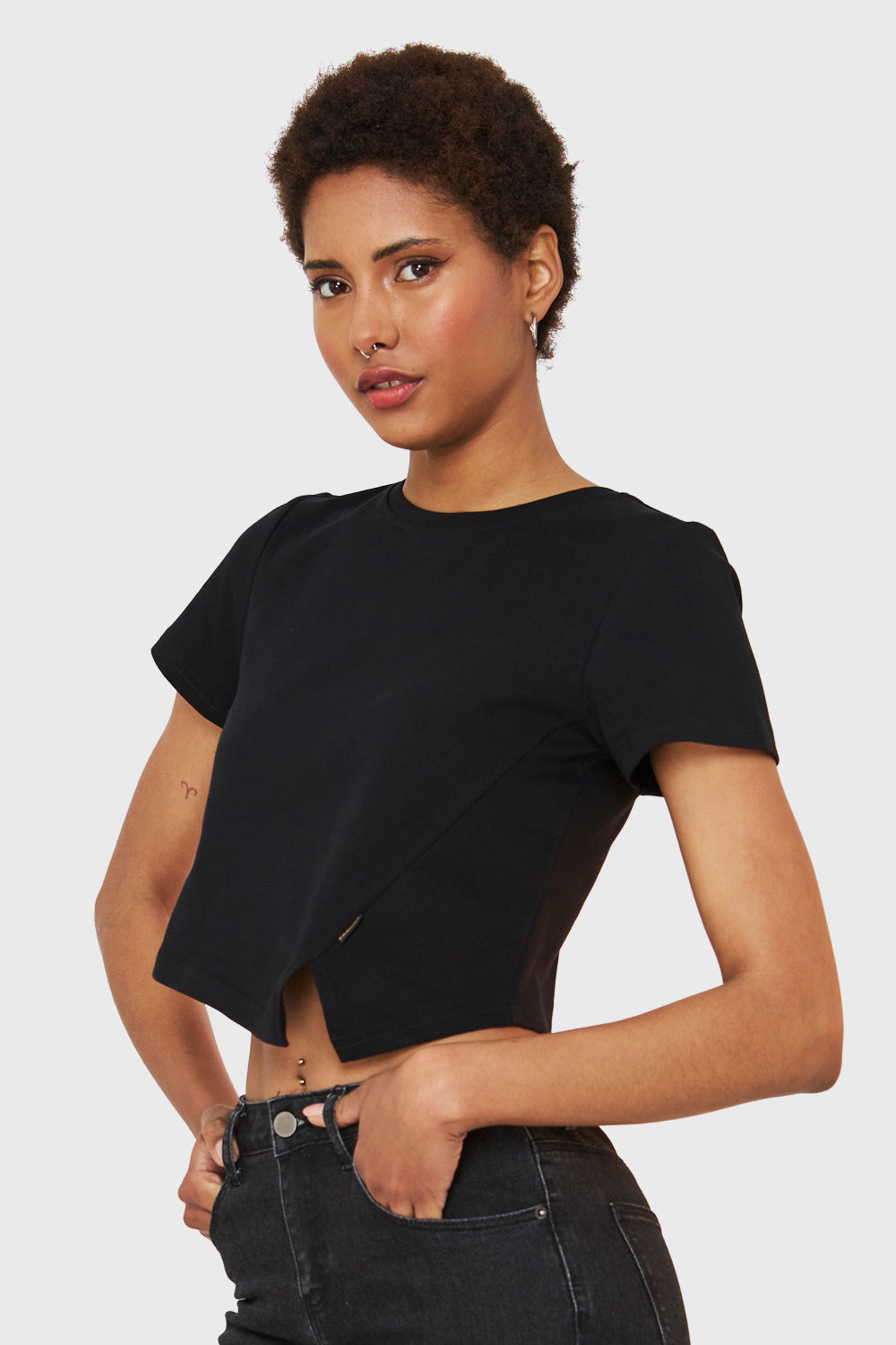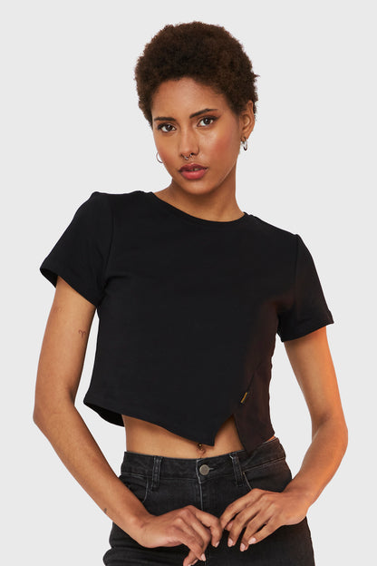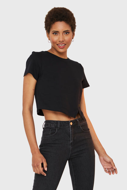 Características: Polera crop manga corta con cuello redondo. Corte asimétrico en la parte baja delantera con etiqueta fashion.