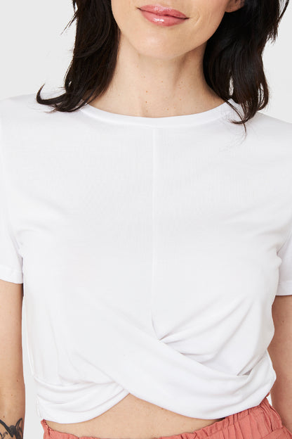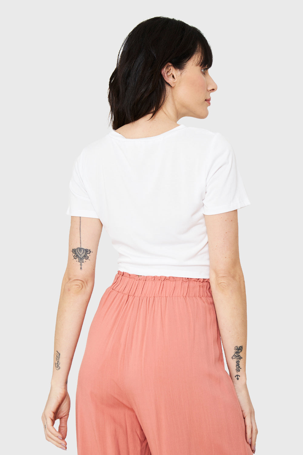 Características: Polera crop manga corta y cuello redondo con nudo frontal.