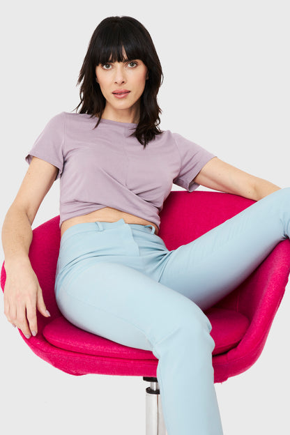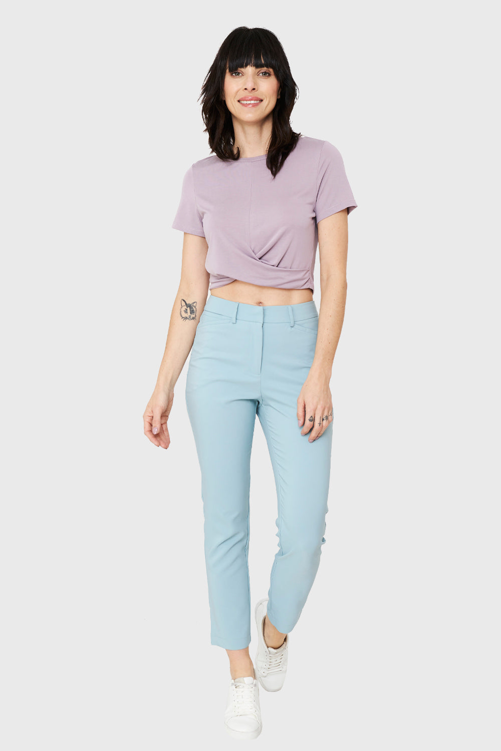 Características: Polera crop manga corta y cuello redondo con nudo frontal.