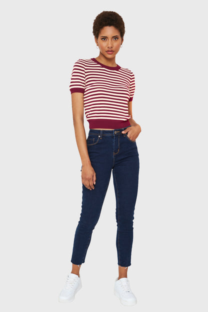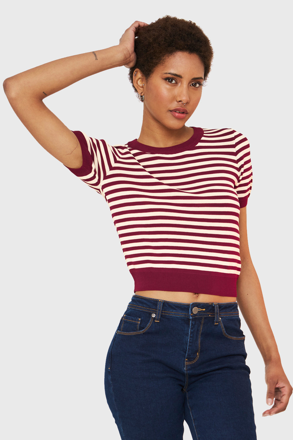 Características: Polera crop rayas elasticada. Bordes color en cuello, mangas y pretina.