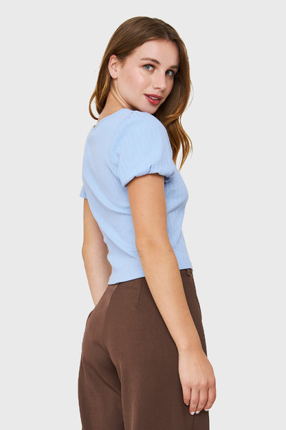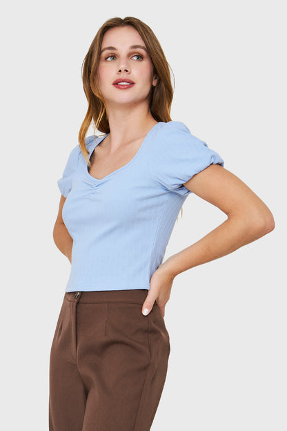 Características: Polera corta escote estilo corazón elasticada y tejido acanalado. Manga corta, con elástico y forro en la manga.