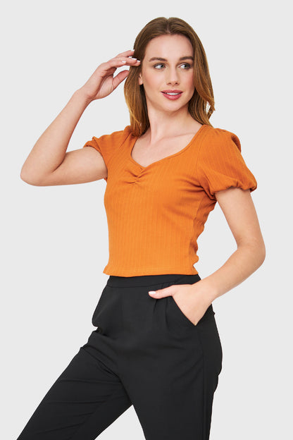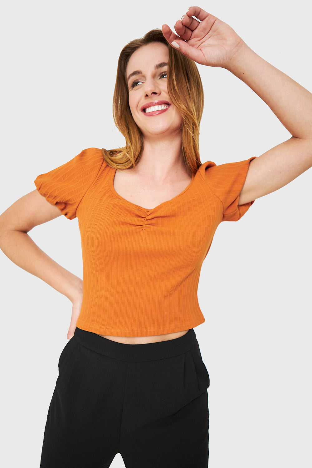 Características: Polera corta escote estilo corazón elasticada y tejido acanalado. Manga corta, con elástico y forro en la manga.
