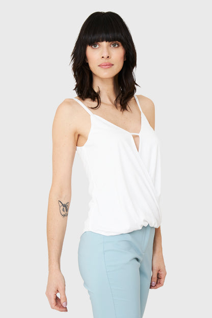 Características: Polera pabilo ajustable con escote cruzado y detalle en el busto. Posee forro y tiene efecto pliegues en la parte baja.