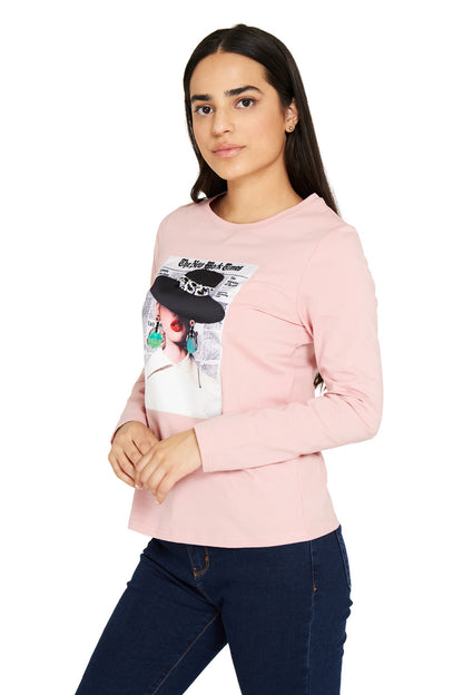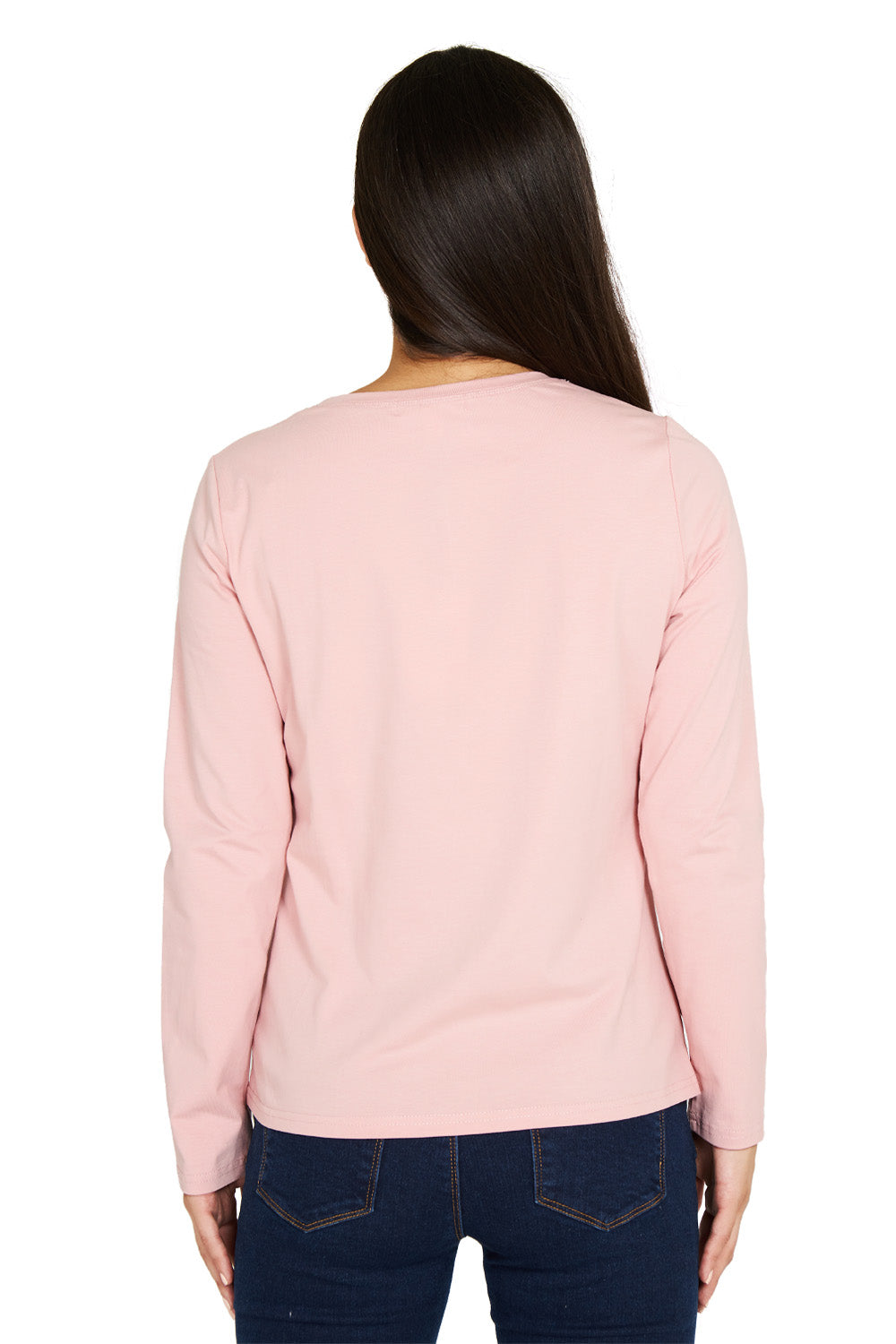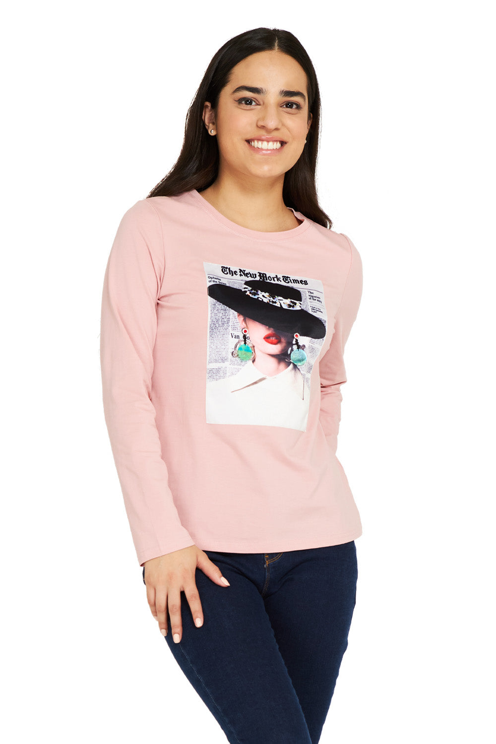 Características: Polera manga larga. Cuello redondo. Estampado con aplicaciones de lentejuelas y mostacillas.