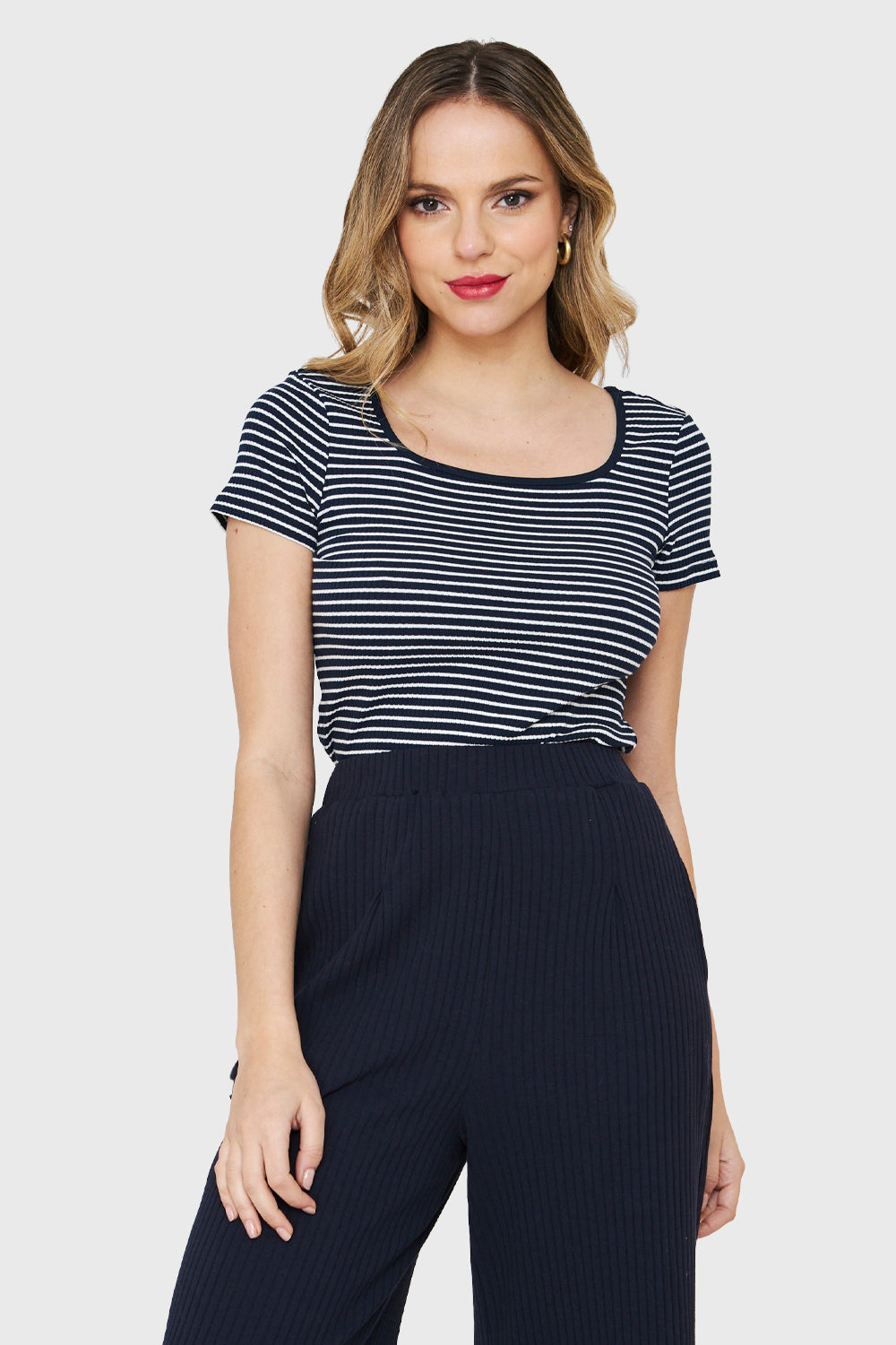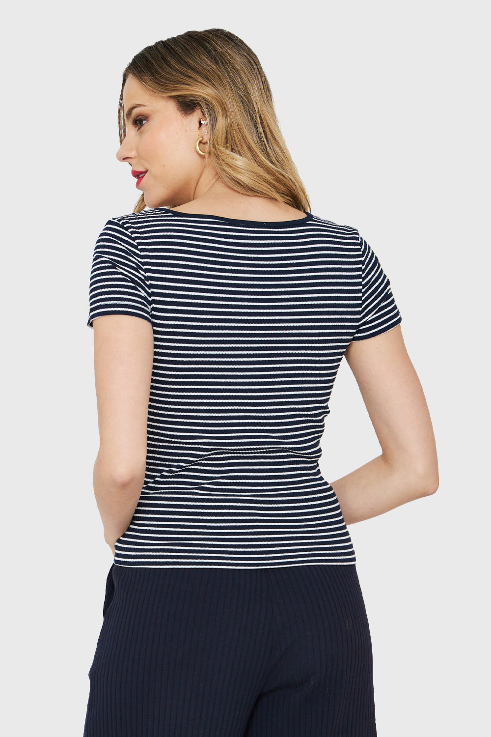 Características: Polera manga corta básica rayas. Escote cuadrado. Muy elasticada.
